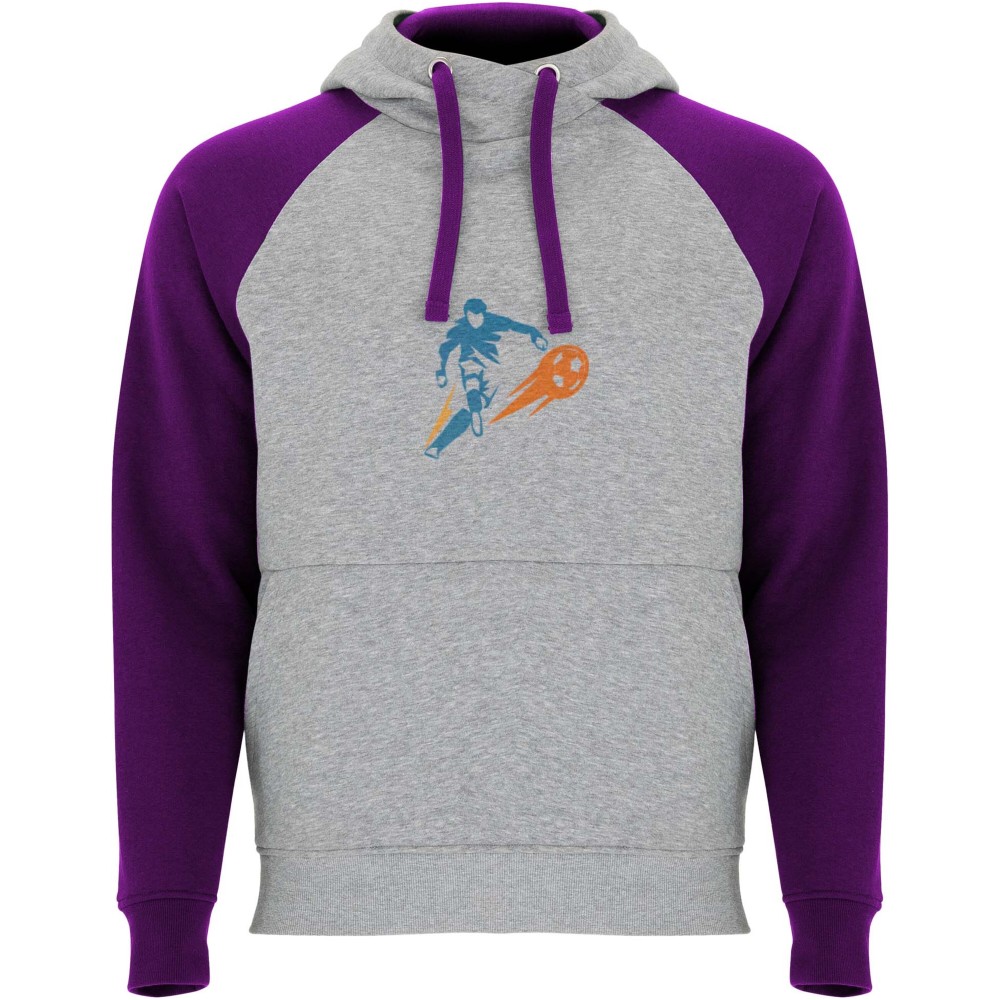 Két színű uniszex kapucnis pulóver. Kapucni keresztezett nyakrésszel és fém kiegészítőkkel. Kontrasztos belső rész a kapucnin, húzózsinór és raglán ujjak. Kenguru zseb. Rugalmas 1x1 passzék és alj. Levehető címke. Emblémázás: Hímzés, Szitanyomás