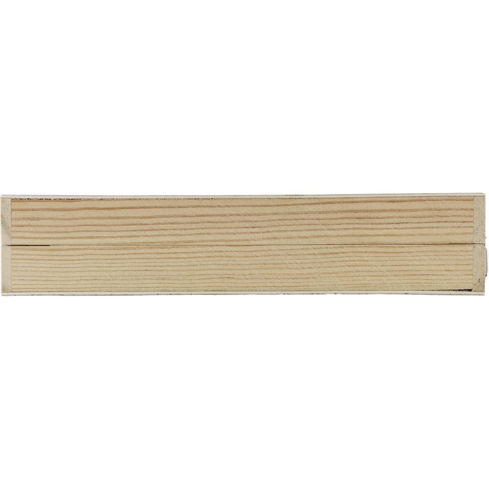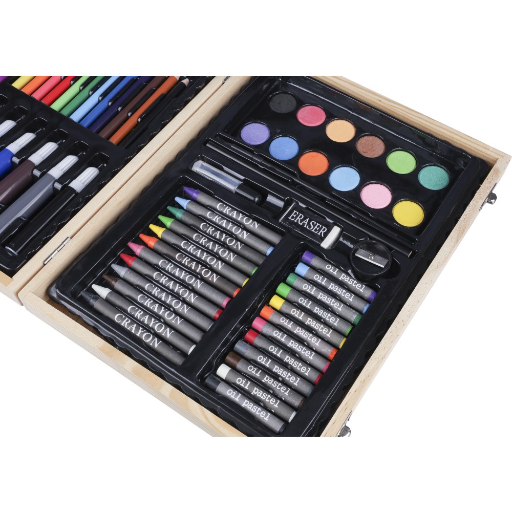 66 db-os rajzkészlet fa tartóban, fa fogantyúval. Tartalma: 12 db zsírkréta, 12 db színes filctoll, 12 db kihegyezett színes ceruza, 12 db olajpasztell kréta, 12 db festék, ragasztóstift, radír, ceruzahegyező, vonalzó, ecset és festőpaletta. Csomagolása barna papírdoboz. Emblémázás: Gravírozás, Tamponnyomás