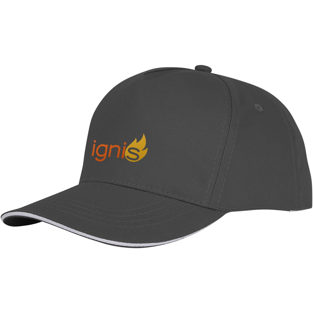 Ceto 5 paneles szendvics baseballsapka formázott szendvics simléderrel, hímzett szellőzőnyílásokkal és tépőzárral. 100% twill pamut. 175 g/m2. Emblémázás: Hímzés, Szitanyomás
