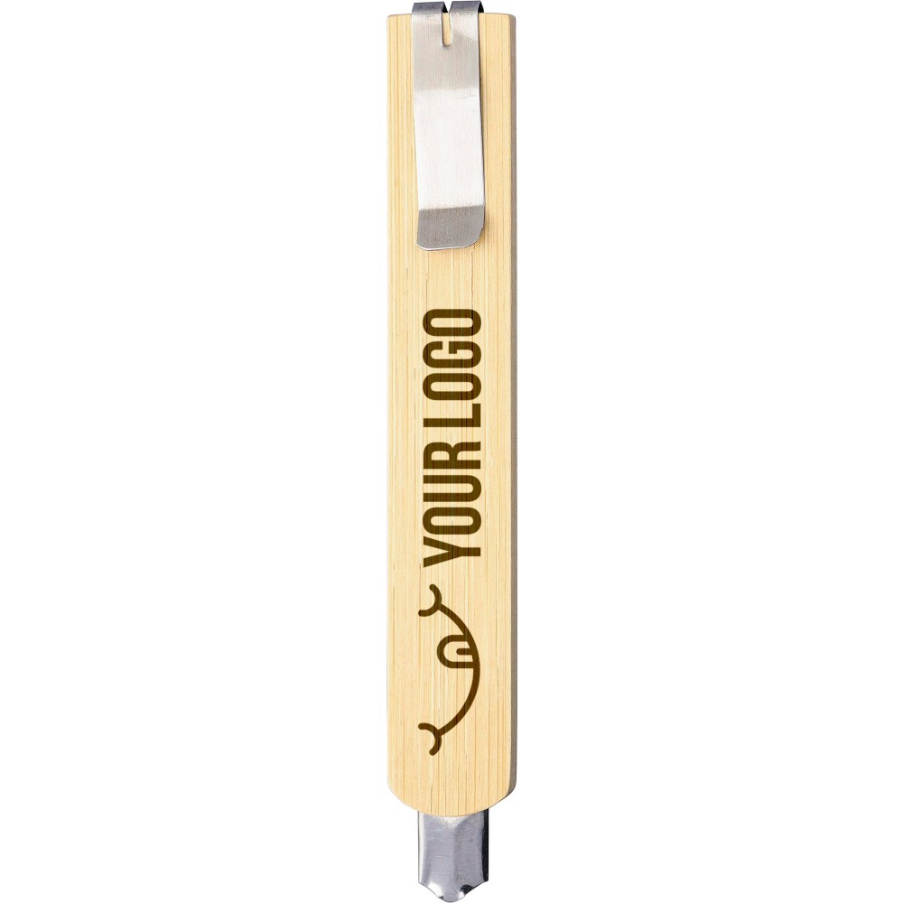 Sniccer bambusz testtel. A hátoldalán fém klip található, amellyel a vágóél rögzíthető, amikor nincs használatban. A pengék szénacélból készültek. Egyenként újrahasznosított műanyag tasakba csomagolva. Anyaga: fém és bambusz. Emblémázás: Gravírozás