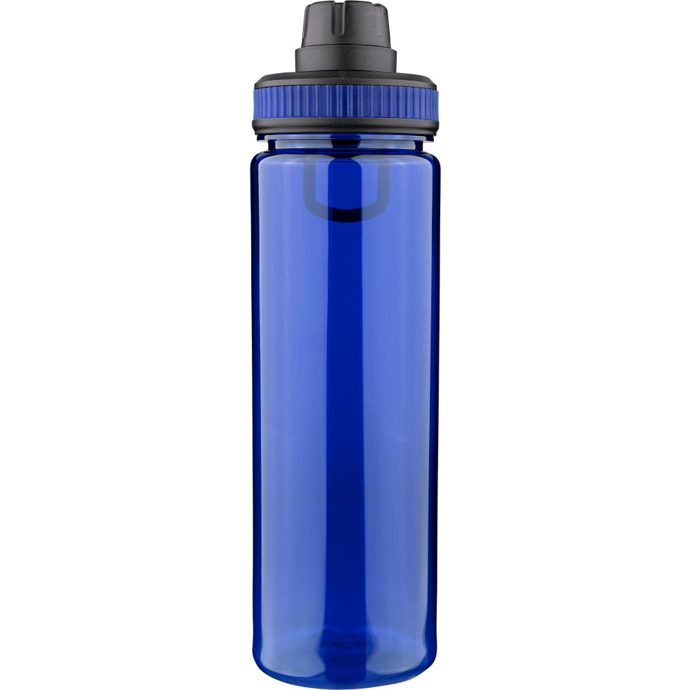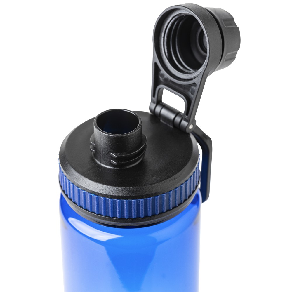 RPET anyagból készült ivópalack PP kupakkal, amely hordozófüllel és csavaros záródással rendelkezik, valamint a palack áttetsző testének színével harmonizáló szilikon díszítéssel. Űrtartalma 750 ml. Emblémázás: Körszita