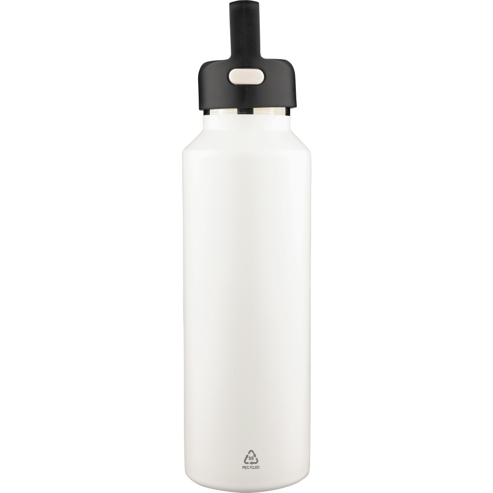 Újrahasznosított rozsdamentes acélból készült, vákuumszigetelésű palack 600 ml űrtartalommal, duplafalú kialakítással, hordozófüllel ellátott PP fedéllel és kétféle (dupla) nyitási lehetőséget biztosító nyomógombos rendszerrel. A palacktesten lézergravírozott recycled (újrahasznosított) alapanyagra utaló logó található. Darabonként barna kartondobozba csomagolva. Emblémázás: Bögredekor