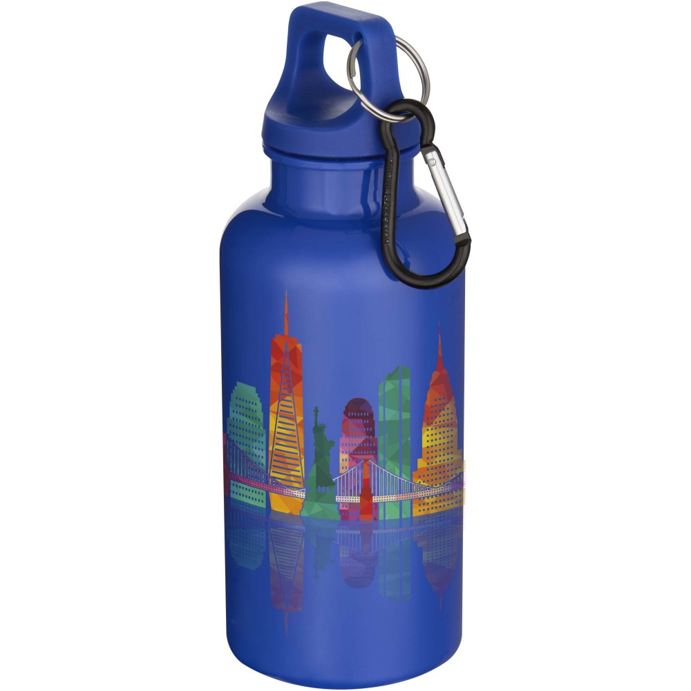 Az RCS tanúsítvánnyal rendelkező RPET-ből készült, tartós, mégis könnyű, 400 ml-es kulacs lehetővé teszi a folyamatos hidratálást. Tökéletes kísérő sportoláshoz, kirándulásokhoz vagy irodai használatra. A szimplafalú Oregon palack csavaros kupakkal rendelkezik, és bőséges felületet kínál bármilyen logó elhelyezésére. A mellékelt karabiner segítségével (mely mászásra nem alkalmas) a kulacs biztonságosan táskához rögzíthető. A termék megfelel az EFSA által jóváhagyott PET újrahasznosítási szabályoknak. Emblémázás: Tamponnyomás