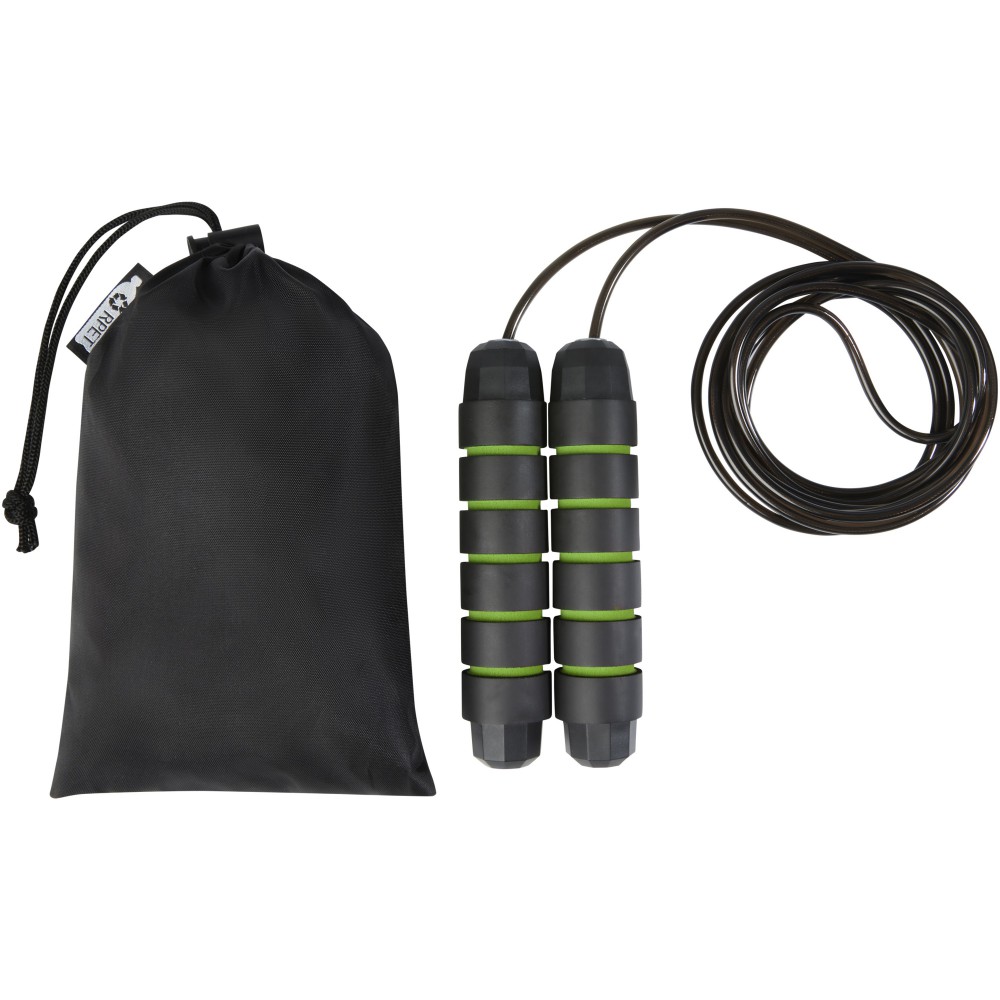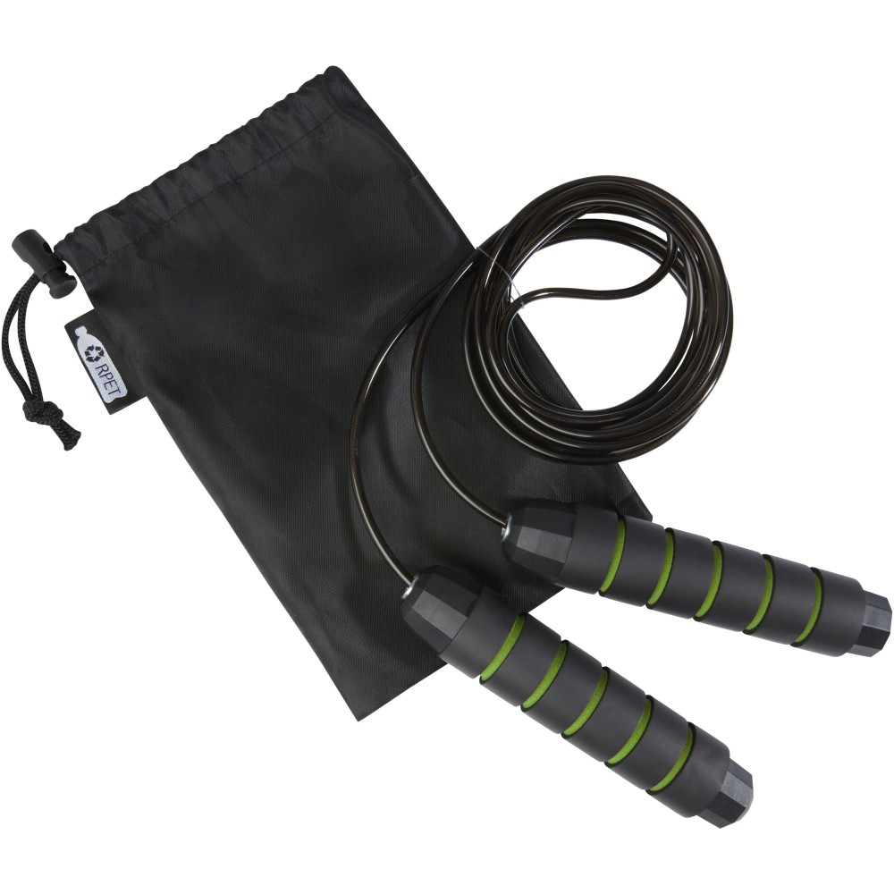 Professzionális ugrálókötél felnőtteknek, ergonomikusan kialakított puha habszivacs fogantyúkkal, mely szilárd és kényelmes fogást biztosít edzés közben. A kötél hossza 310 cm, ami könnyű ugrást tesz lehetővé felnőttek számára 195 cm hosszúságig. A kötél hossza állítható, és beépített, kiváló minőségű, 360 fokban forgatható, nagy sebességű golyóscsapággyal rendelkezik, amely biztosítja a zökkenőmentes, könnyed forgást és elkerüli a gubancolódást. Újrahasznosított PET műanyagból készült tároló tasakkal (21 x 14 cm) szállítjuk, amely remek helyet biztosít a logó nyomtatásához. Emblémázás: Szitanyomás
