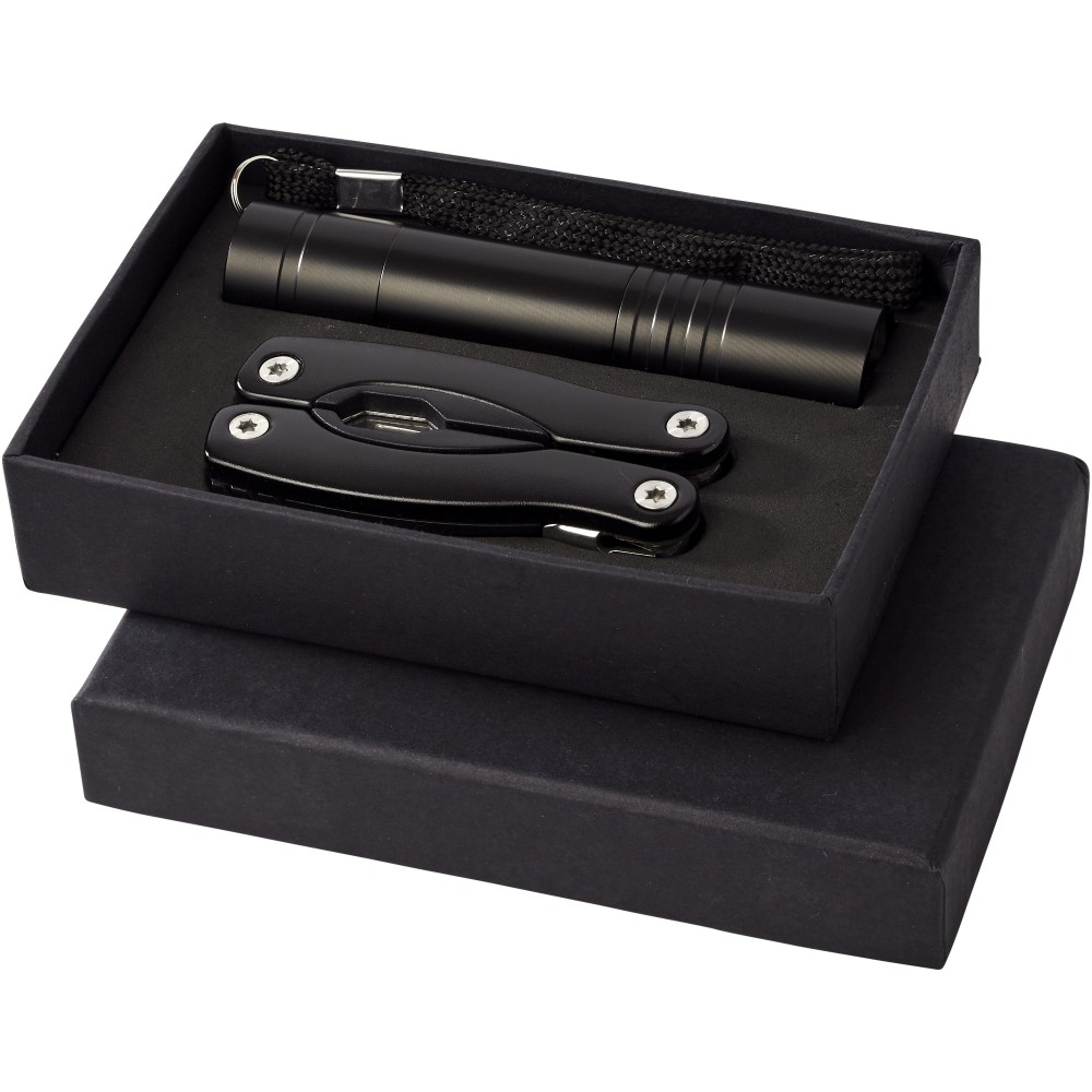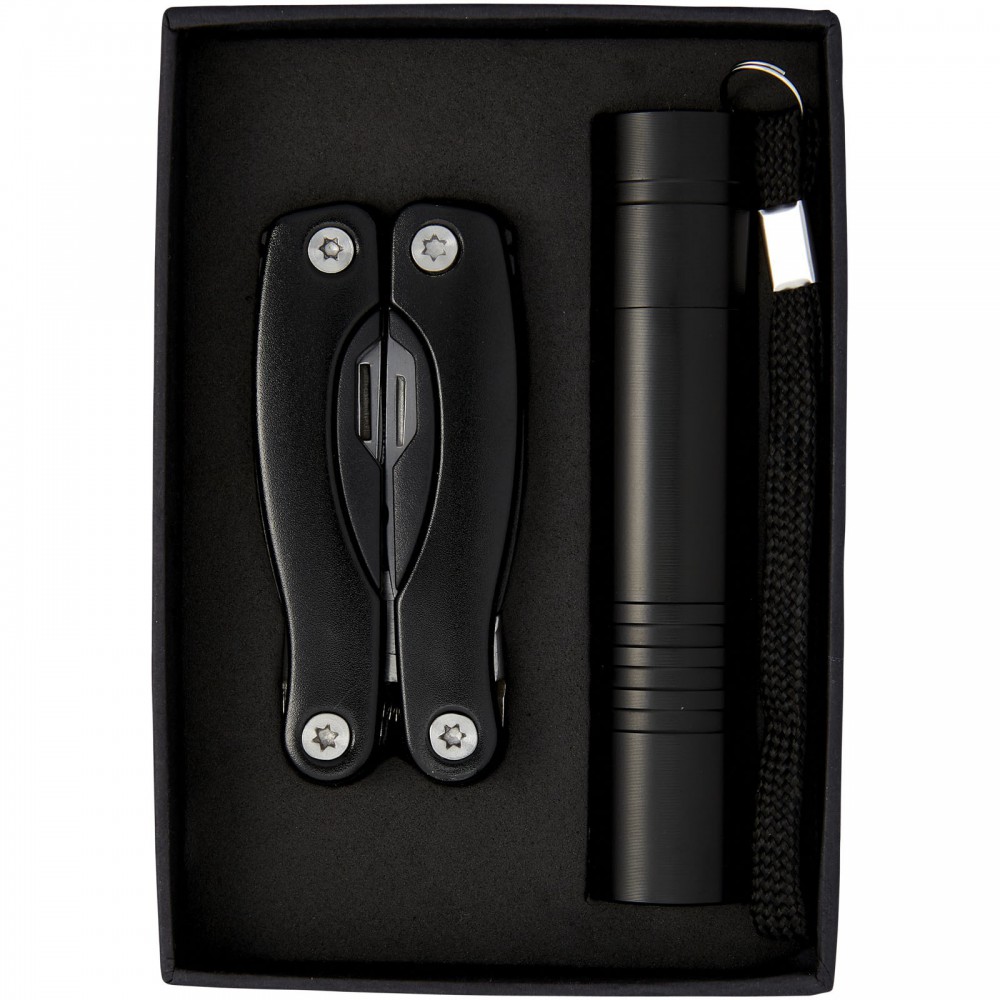 Scout többfunkciós szerszám- és lámpa készlet. 11 funkciós mini szerszám és LED-es lámpa. Az elemet tartalmazza. Csomagolása fekete doboz. Emblémázás: Gravírozás, Tamponnyomás