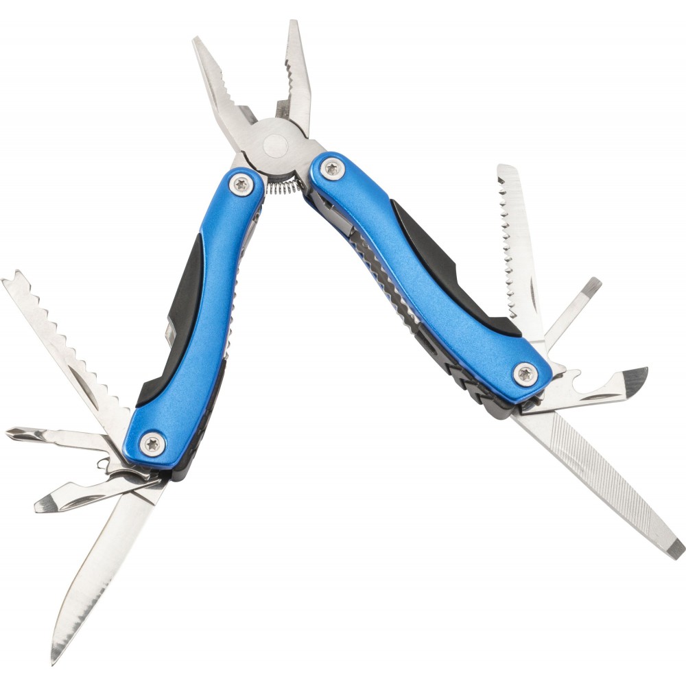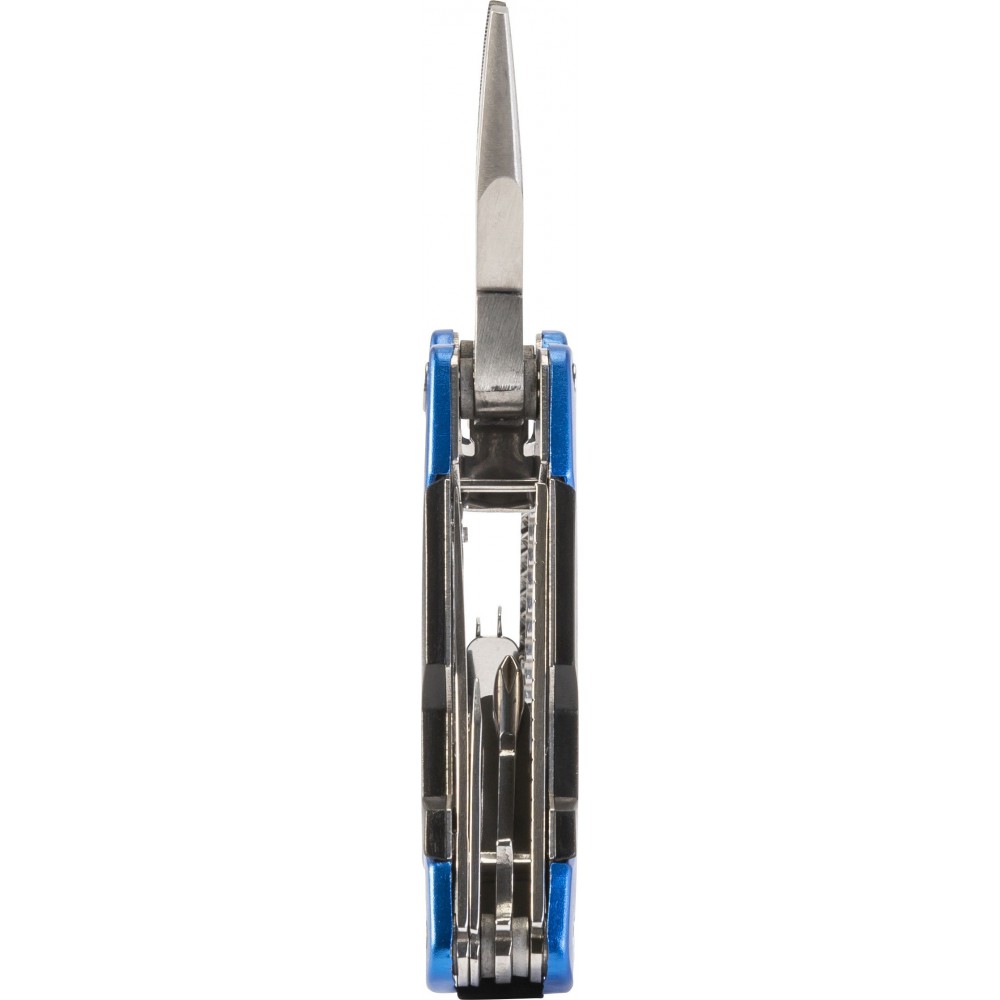 Multifunkciós szerszám. Funkciói: csípőfogó, fűrész, bicska, két csavarhúzó (egy laposfejű és egy Phillips), reszelő, üvegnyitó, halfiléző, diótörő és egy incs beosztású mérő. Tokban érkezik. Alumínium, rozsdamentes acél Emblémázás: Gravírozás, Tamponnyomás