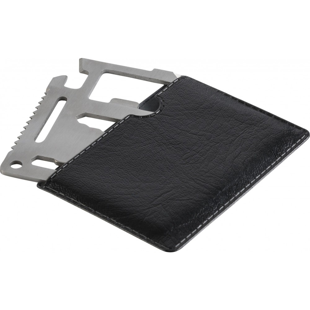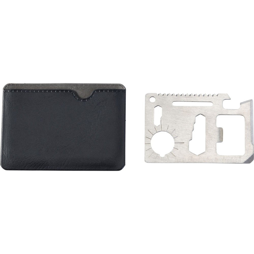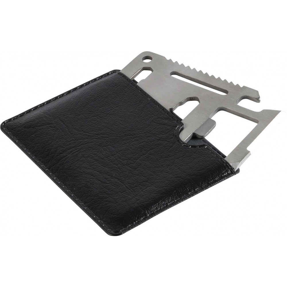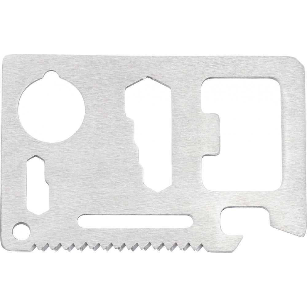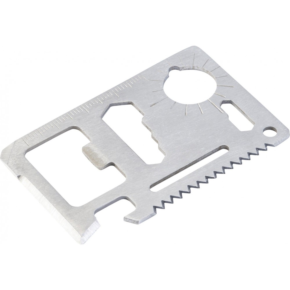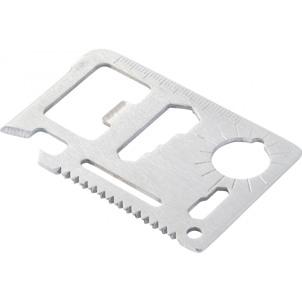 Többfunkciós szerszám 11 funkcióval. Funiciók: kés, doboznyitó, szárnyascsavar, fűrész, csavarhúzó, üvegnyitó, vonalzó és különböző méretű kulcsok. Csomagolása PU tok. rozsdamentes acél Emblémázás: Gravírozás, Tamponnyomás