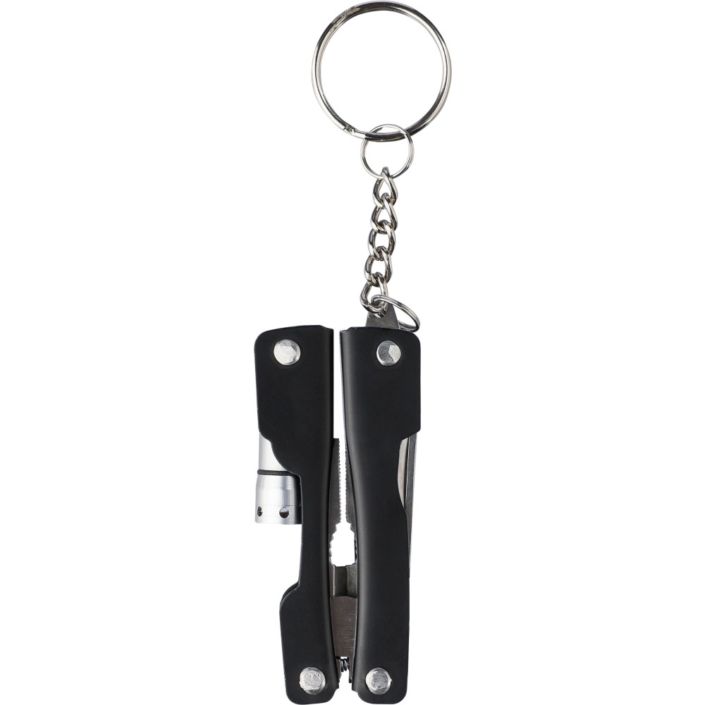 Összecsukható multifunkciós szerszám 10 funkcióval és LED zseblámpával. 600D poliészter tokban, tépőzáras záródással. A tok övre rögzíthető. Tartalmazza az elemeket. Egyenként barna kartondobozba csomagolva. Anyaga: rozsdamentes acél. Emblémázás: Gravírozás, Tamponnyomás