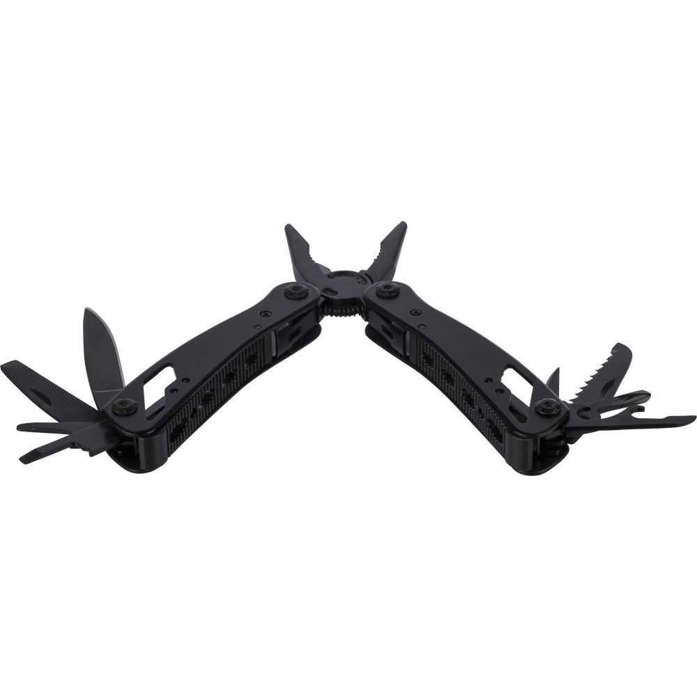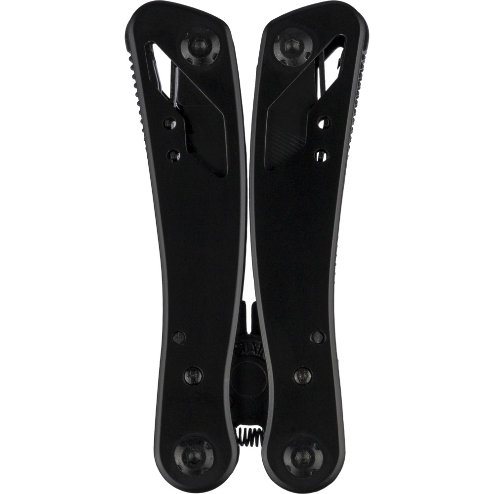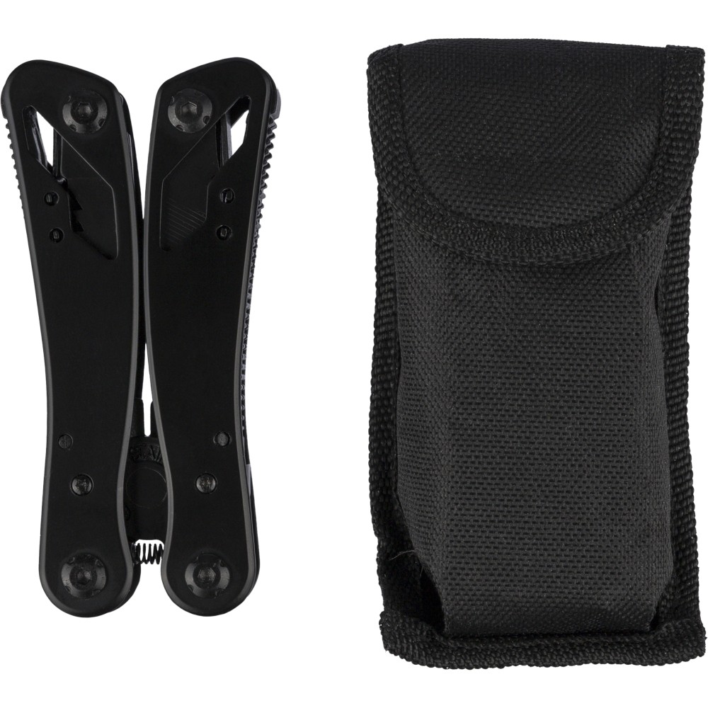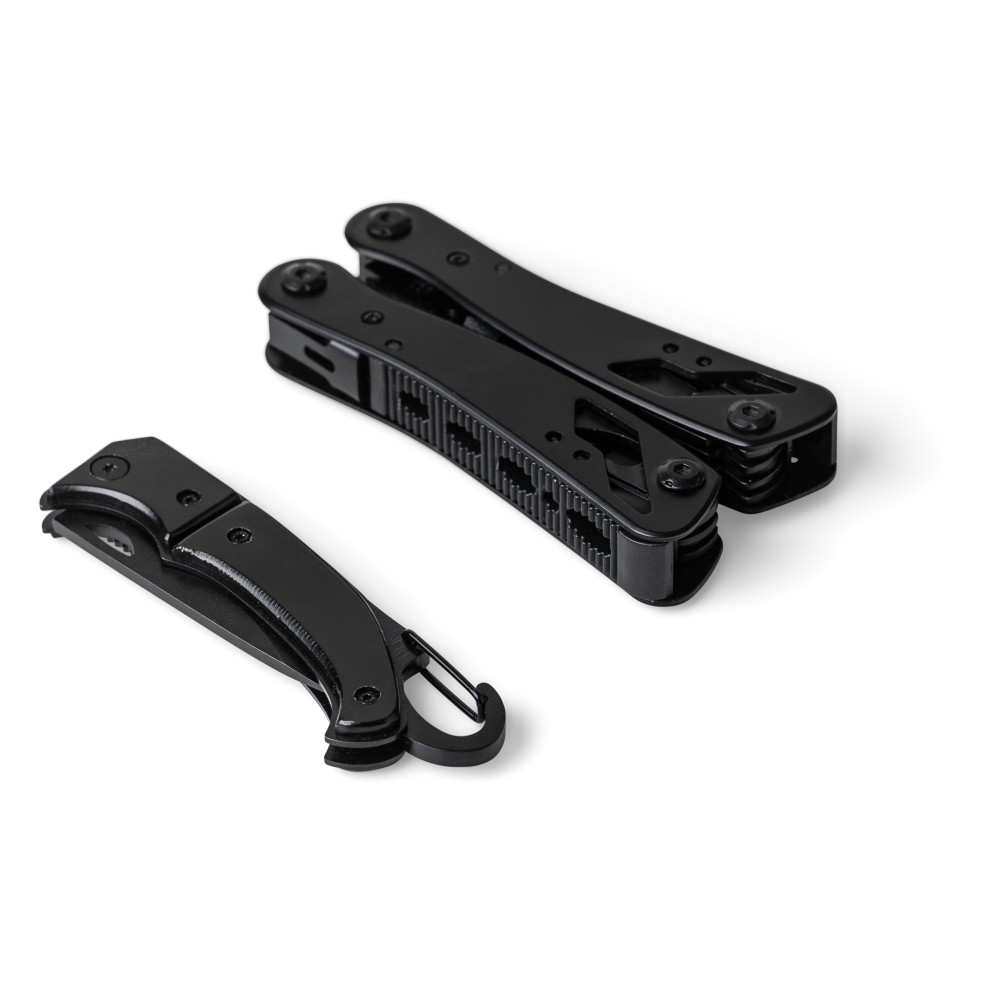 Fekete alumíniumból és rozsdamentes acélból készült multifunkciós szerszám 13 funkcióval, beleértve a késeket, csavarhúzókat, fogót, fűrészt, reszelőt, emelőkart, biteket, rugót, rögzítőrudat, konzervnyitót és támasztékot. Tokkal szállítva, amely tépőzáras övbújtatóval rendelkezik, valamint további külső dobozzal. Darabonként barna kartondobozba csomagolva. Emblémázás: Gravírozás, Tamponnyomás