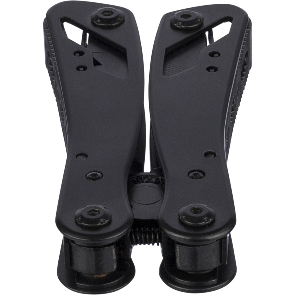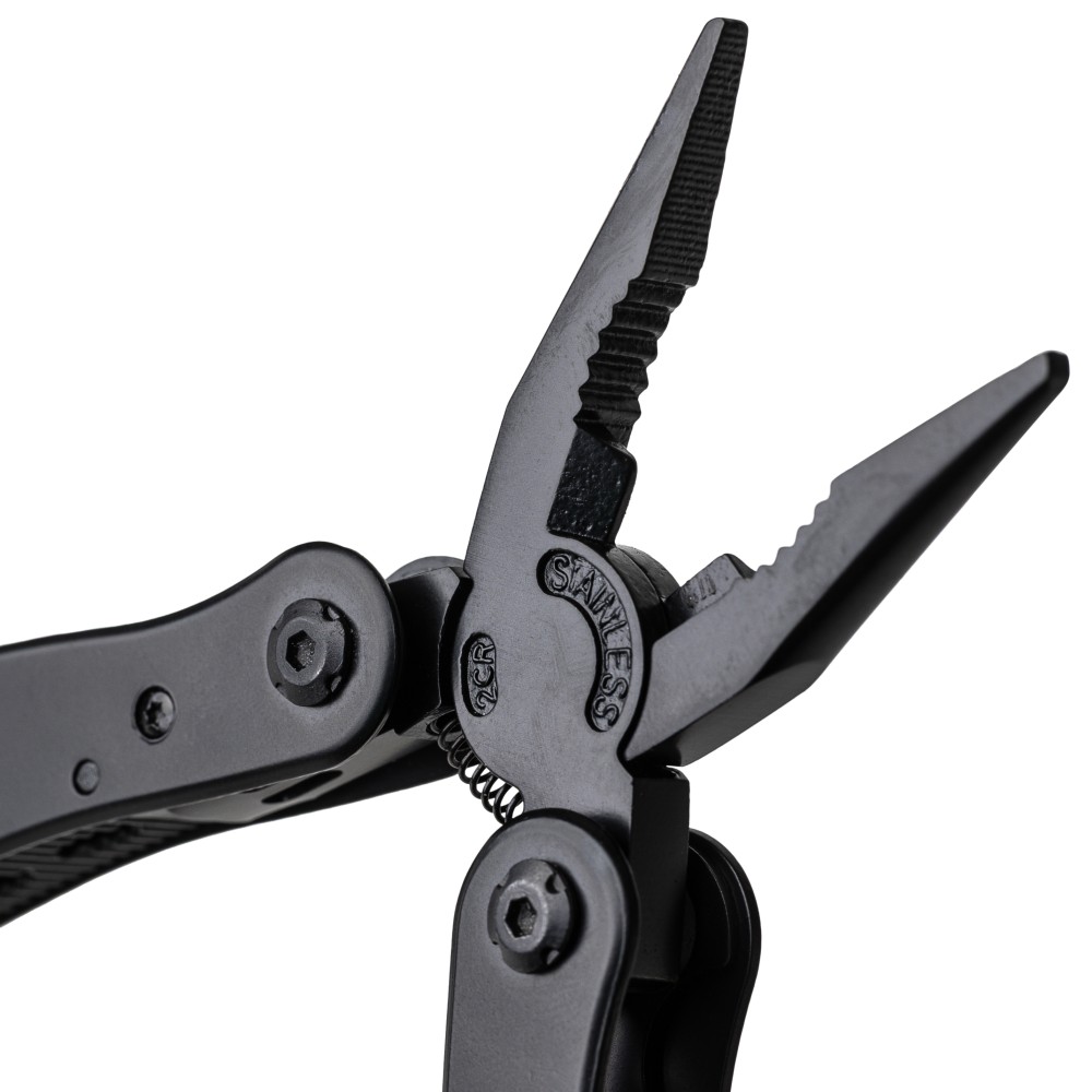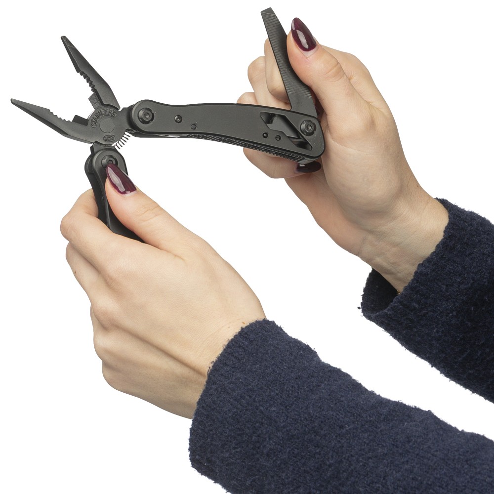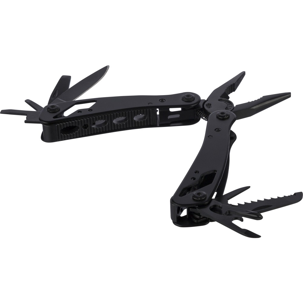 Fekete alumíniumból és rozsdamentes acélból készült multifunkciós szerszám 13 funkcióval, beleértve a késeket, csavarhúzókat, fogót, fűrészt, reszelőt, emelőkart, biteket, rugót, rögzítőrudat, konzervnyitót és támasztékot. Tokkal szállítva, amely tépőzáras övbújtatóval rendelkezik, valamint további külső dobozzal. Darabonként barna kartondobozba csomagolva. Emblémázás: Gravírozás, Tamponnyomás