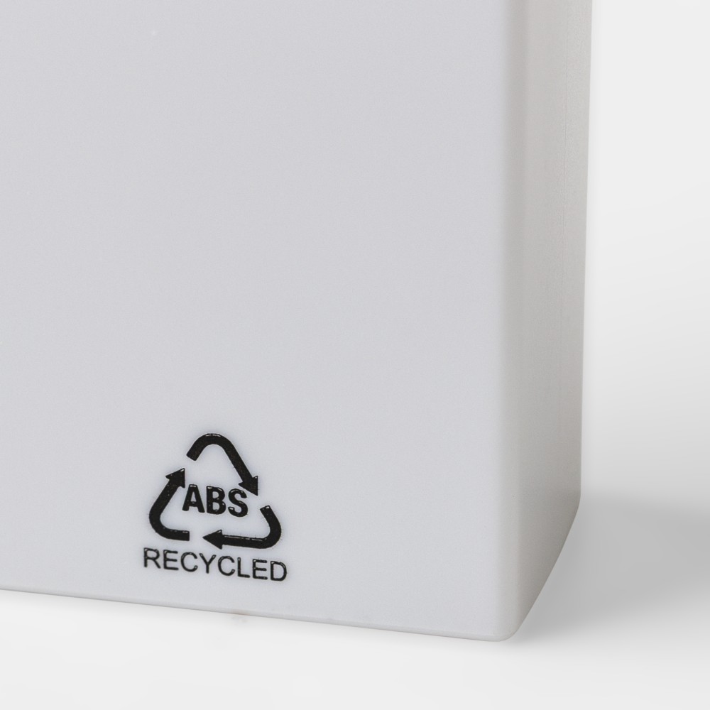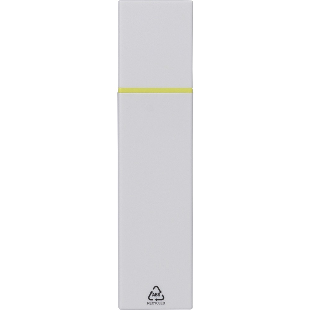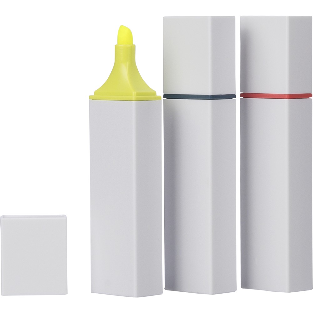Újrahasznosított ABS-ből készült szövegkiemelő fehér testtel és színes díszítéssel. Klikkes záródással rendelkezik, 2 évig véd a kiszáradás ellen. A terméken Recycled ABS alapanyagra utaló logó található. Emblémázás: Tamponnyomás