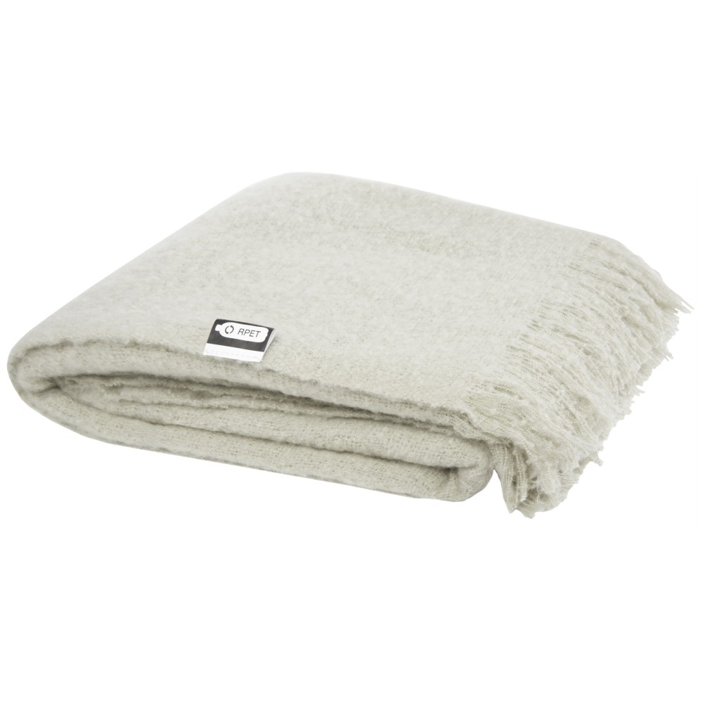 Ultrapuha újrahasznosított PET-ből készült moher takaró összefogó pánttal. A rojtok hossza: 10 cm mindkét végén. Összefogó szalag mérete: 72 x 4 cm. 215 g/m2. Emblémázás: Hímzés