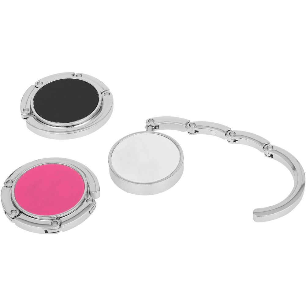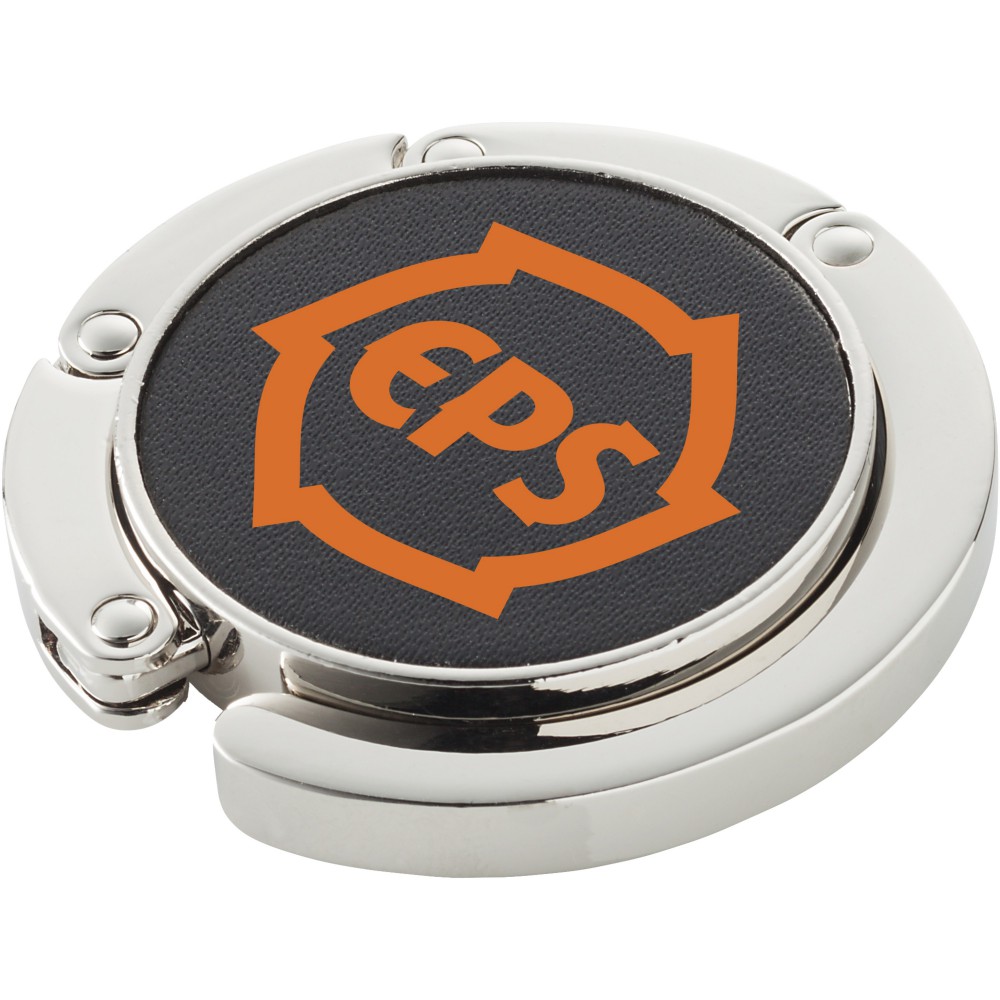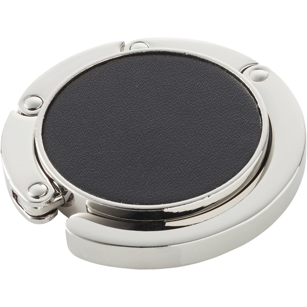 Összehajtható táskaakasztó, mellyel tisztán és biztonságban tarthatja táskáját. Az akasztót bármely felszín peremére felrögzítheti, max. 4,5 kg súlyt bír el. Fekete ajándékdobozban. Emblémázás: Tamponnyomás, UV nyomtatás