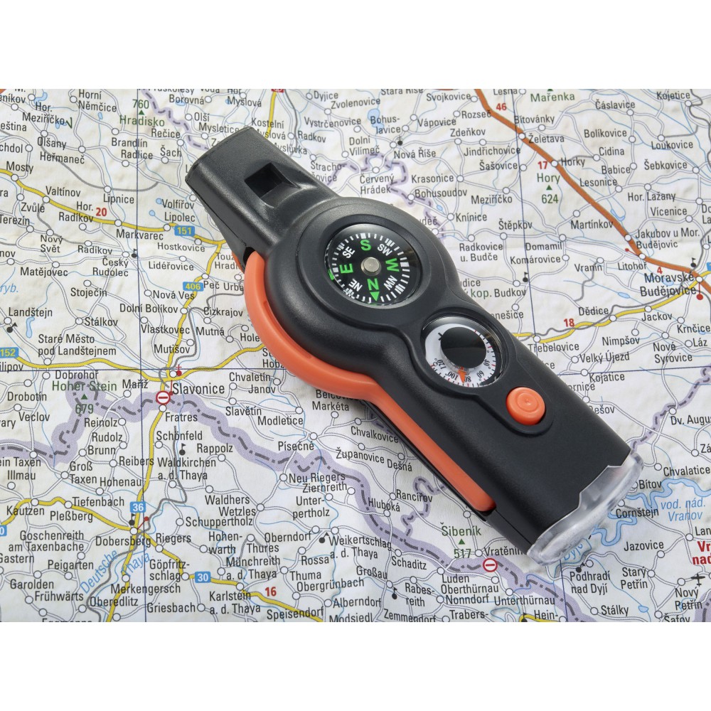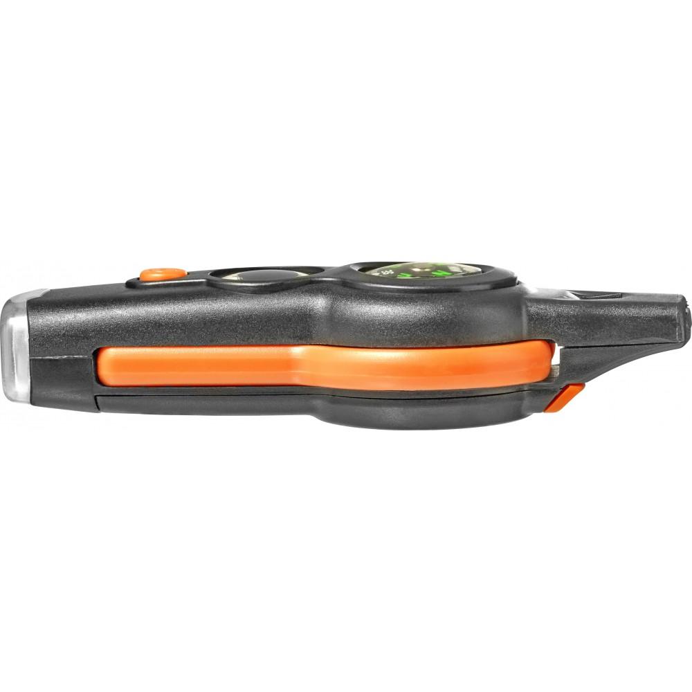 Többfunkciós túlélőeszköz. Az eszköz a következőket tartalmazza: síp, iránytű, hőmérő (° C és ° F), lámpa, tükör, nagyító és zsinór biztonsági zárral. ABS műanyag. Emblémázás: Tamponnyomás