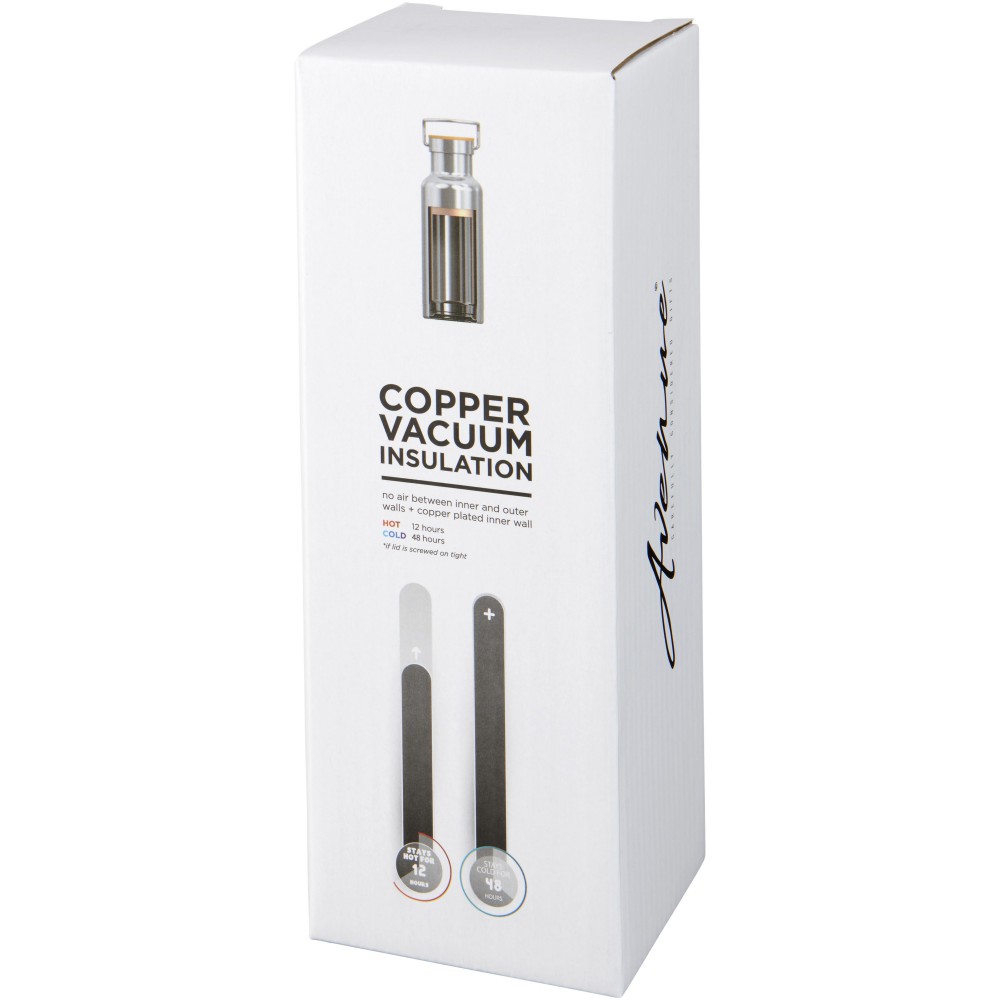 Duplafalú, vákuumos, réz szigetelésű sportpalack 480 ml űrtartalommal. Műanyagot nem tartalmaz. Hidegtartó képesség 48 óra, melegtartó képesség 12 óra. A duplafalas kialakításnak köszönhetően nincs párakicsapódás. Szivárgásmentes. Szénsavas italokkal nem használható. Mosogatógépben nem mosható és mikrohullámú sütőben történő melegítésre nem alkalmas. Csomagolása Avenue díszdoboz. Rozsdamentes acél. Emblémázás: Gravírozás