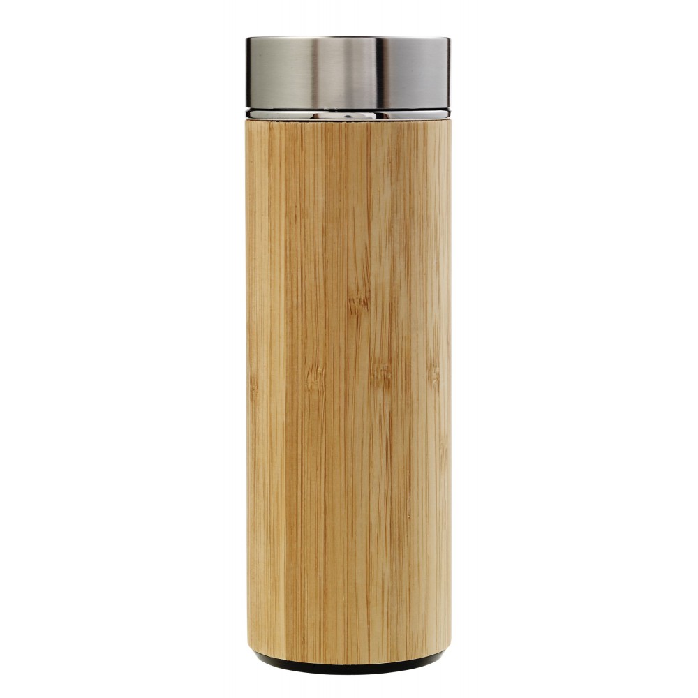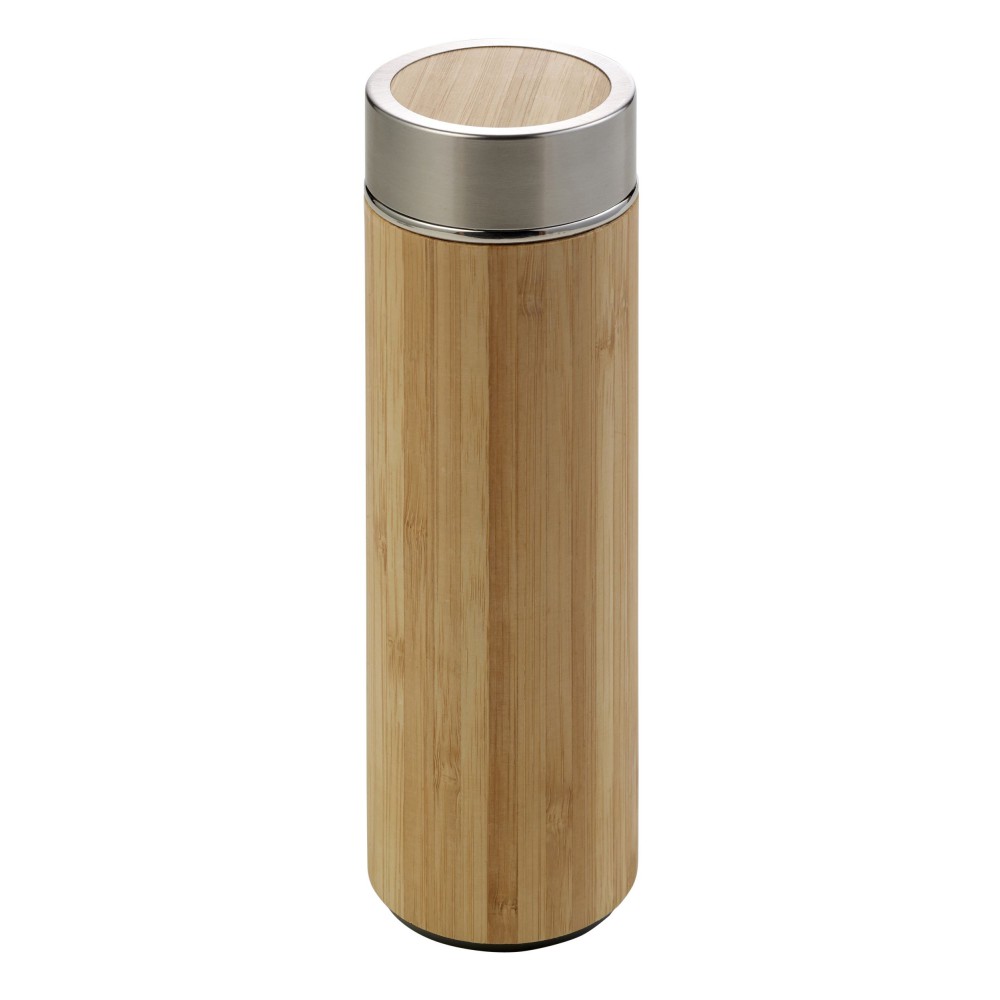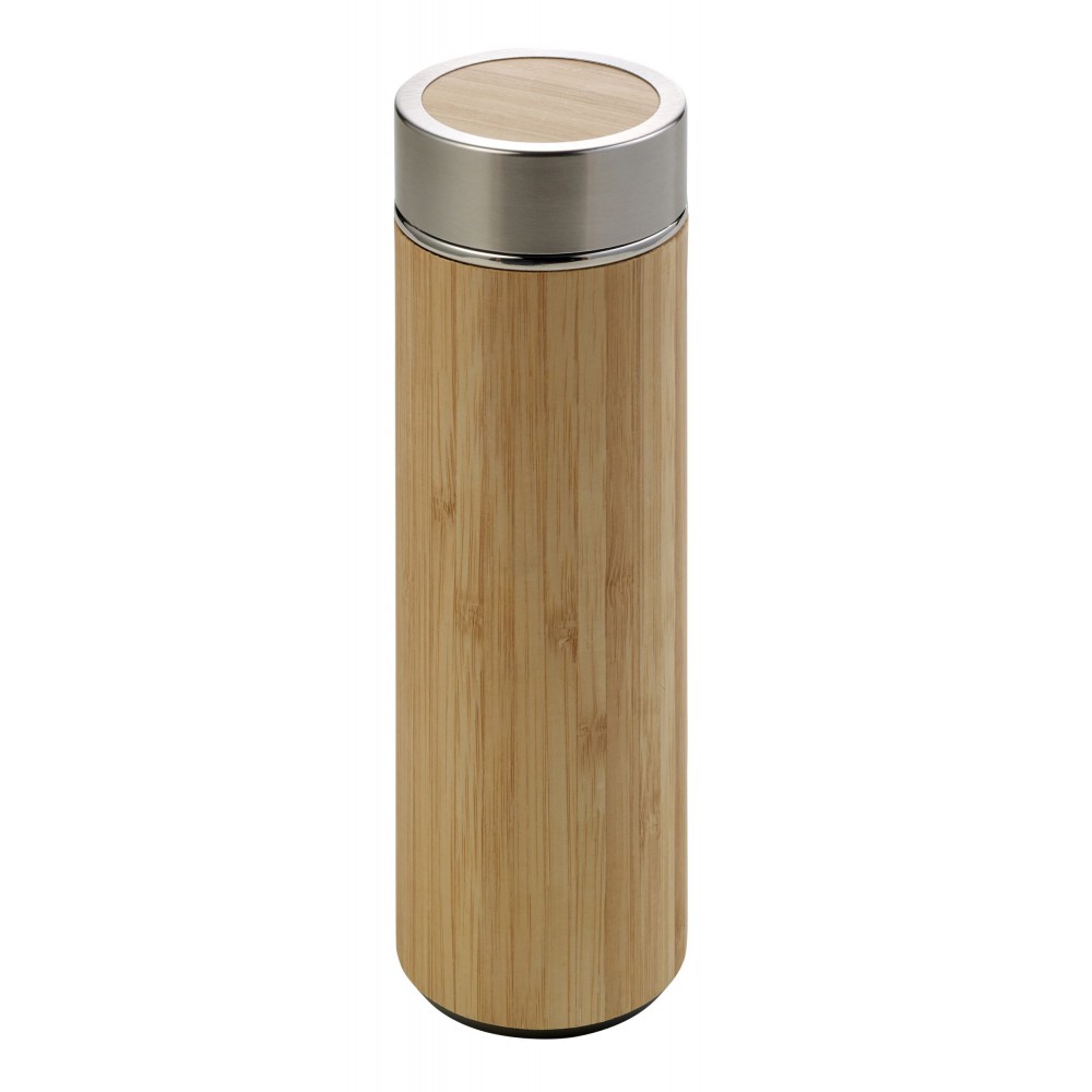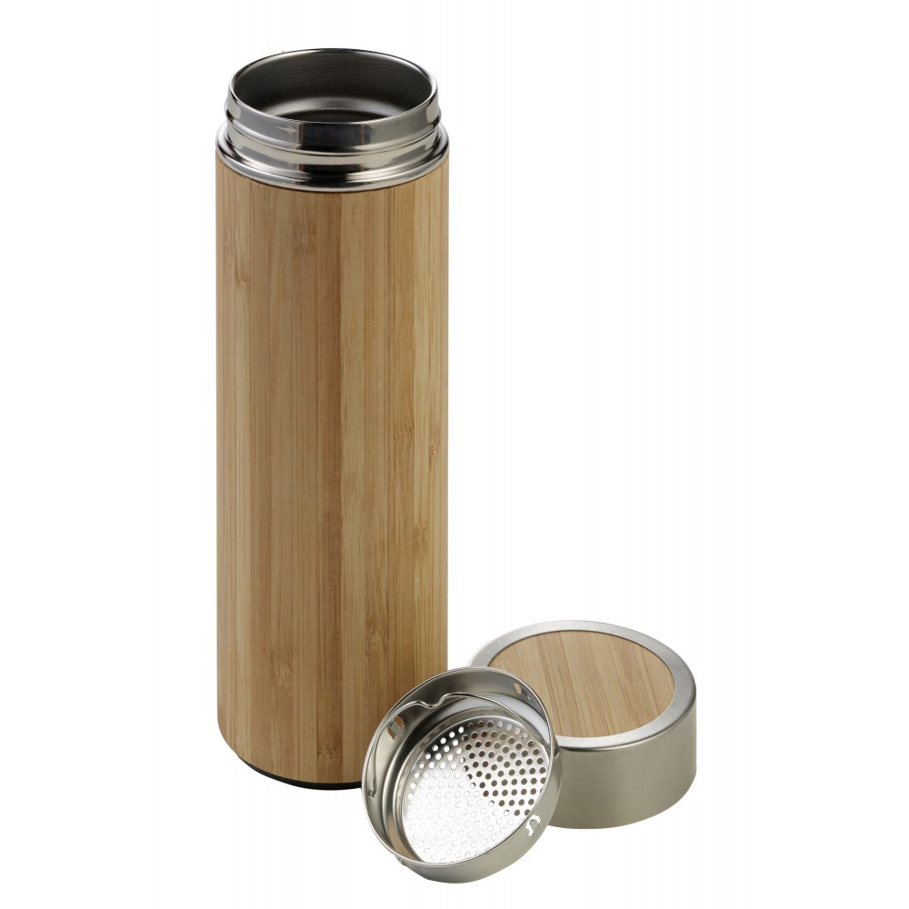 Duplafalú, vákuumos termosz fém teaszűrővel. Űrtartalom: 420 ml. Bambusz és rozsdamentes acél. Csomagolása fehér papírdoboz. Emblémázás: Gravírozás, Tamponnyomás