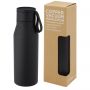 Réz vákuumszigetelt rozsdamentes acél palack klasszikus és elegáns dizájnnal. PU bőr szíjjal és részlettel a fedélen. Ez ideálissá teszi a lézergravírozáshoz, amely a logót ezüst színben emeli ki, gyönyörű vizuális hatást hozva létre. A 18/8-as rozsdamentes acél duplafalú réz vákuumszigetelésével az italok több órán keresztül melegek vagy hidegek maradnak. A német élelmiszerbiztonsági jogszabályok (LFGB) szerint tesztelték és jóváhagyták, és a REACH előírásai szerint tesztelték a ftaláttartalmat. Szivárgásmentes. Szénsavas italokkal nem használható. Mosogatógépben nem mosható és mikrohullámú sütőben történő melegítésre nem alkalmas. Űrtartalom: 500 ml. Újrahasznosított karton díszdobozban. Emblémázás: Gravírozás, Tamponnyomás