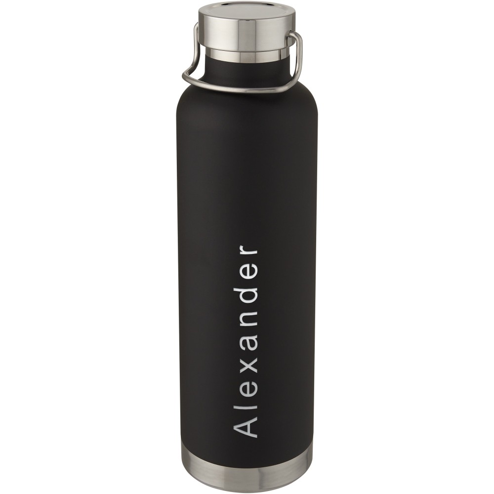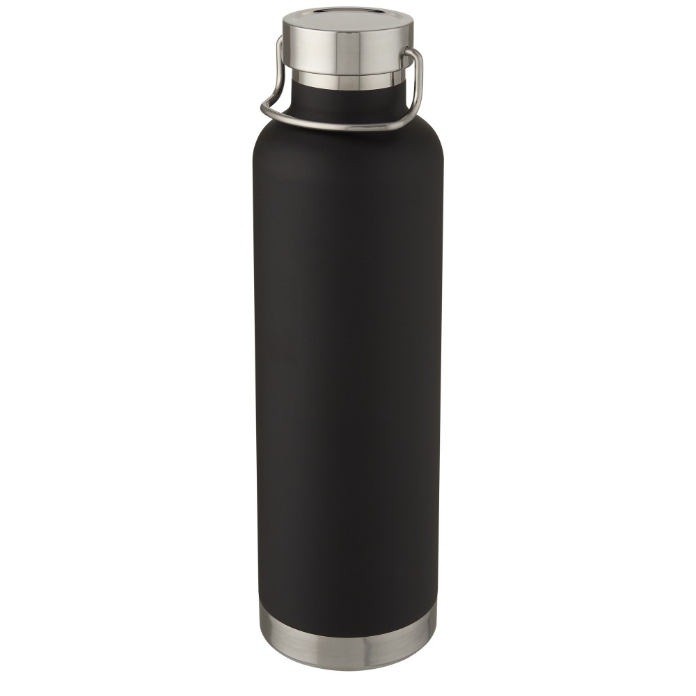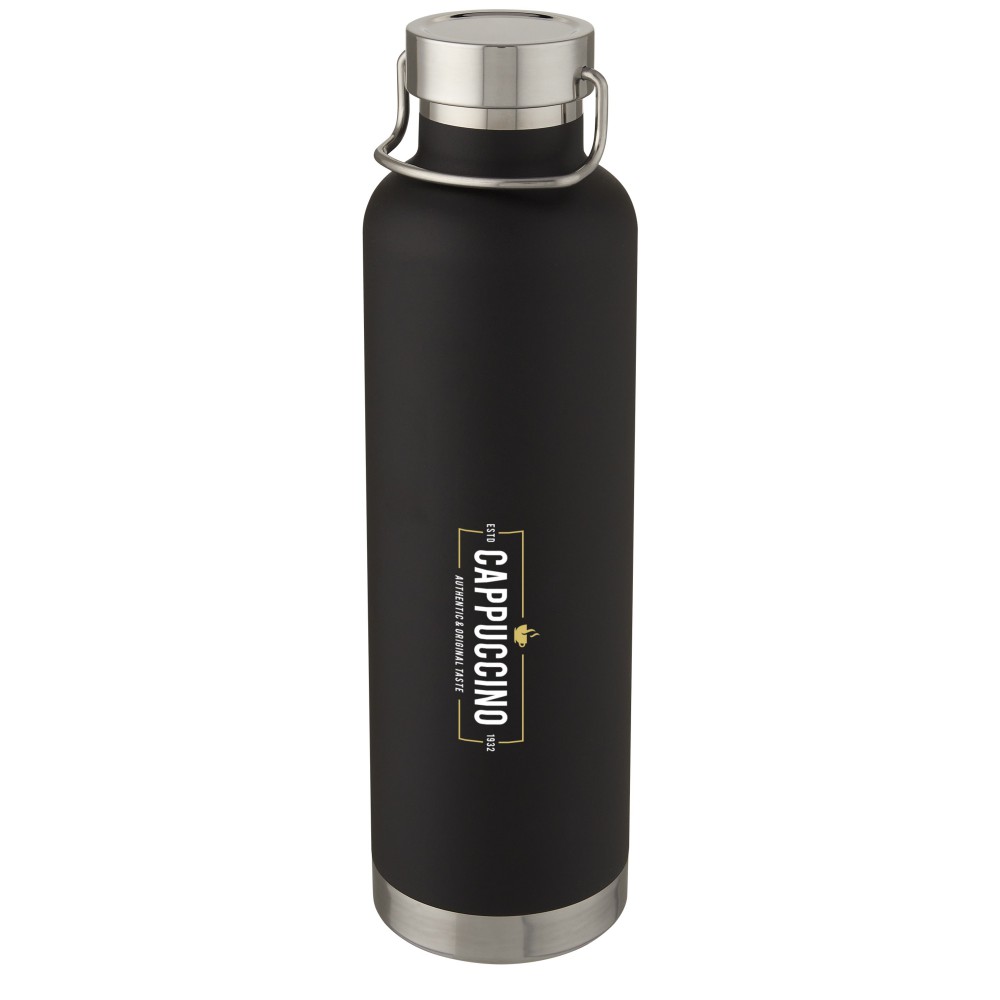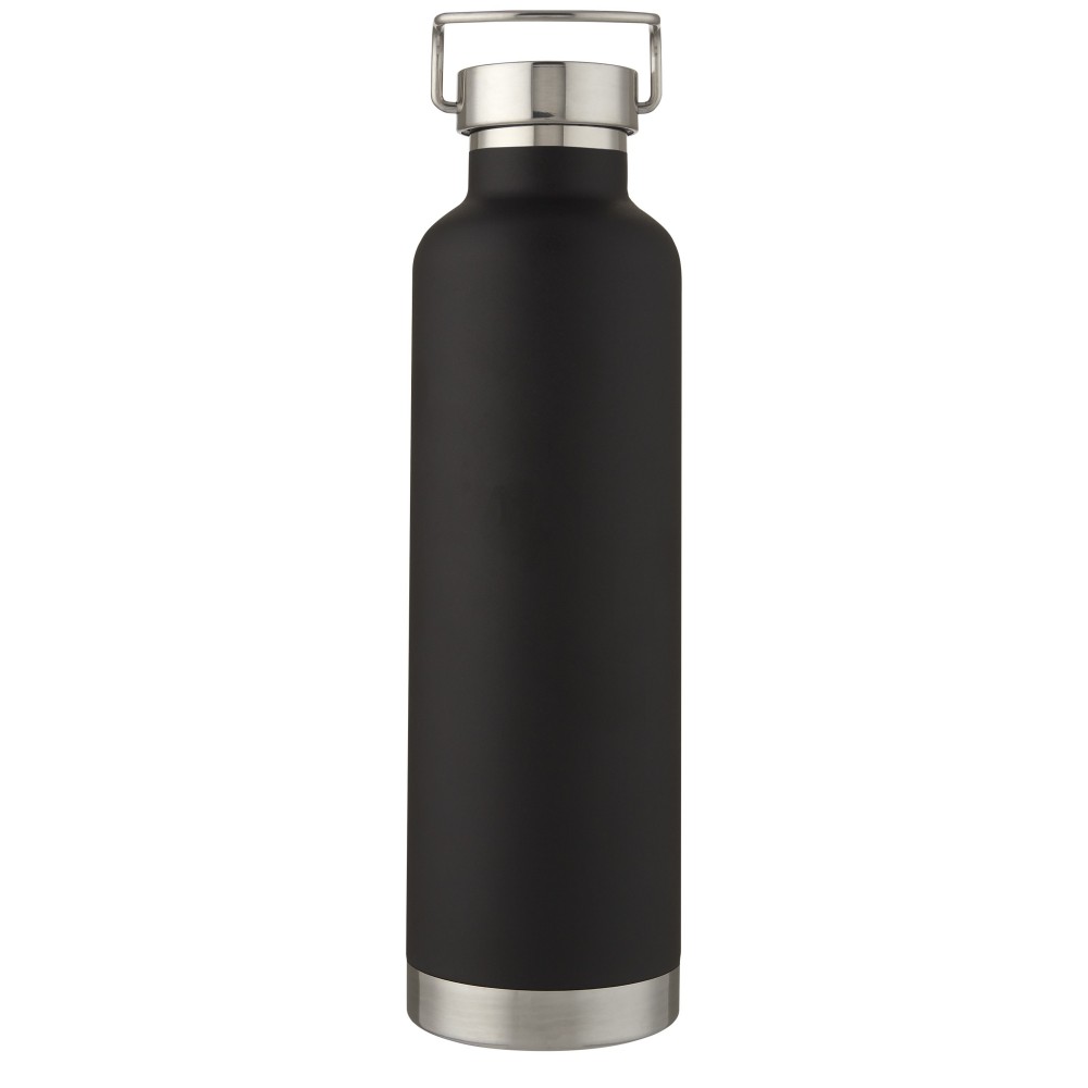 Nagy, duplafalú sportpalack 18/8-as rozsdamentes acél vákuumkonstrukcióval és rézszigeteléssel, amely több órán keresztül melegen vagy hidegen tartja az italokat. A konstrukció megakadályozza a páralecsapódást a palack külső oldalán, és a trendi porfújt bevonat extra tartóssá teszi. Rozsdamentes acél, csavaros fedél tartós, rozsdamentes acél fogóval. Széles nyílás a könnyű feltöltéshez, öntéshez és tisztításhoz. BPA-mentes, a német élelmiszerbiztonsági törvény (LFGB) szerint tesztelt és jóváhagyott. Ftaláttartalomra tesztelve és jóváhagyva a REACH előírásai szerint. Jégkockákhoz tökéletes. Szivárgásmentes. Szénsavas italokkal nem használható. Mosogatógépben nem mosható és mikrohullámú sütőben történő melegítésre nem alkalmas. Űrtartalom: 1 l. Újrahasznosított karton díszdobozban. Emblémázás: Gravírozás