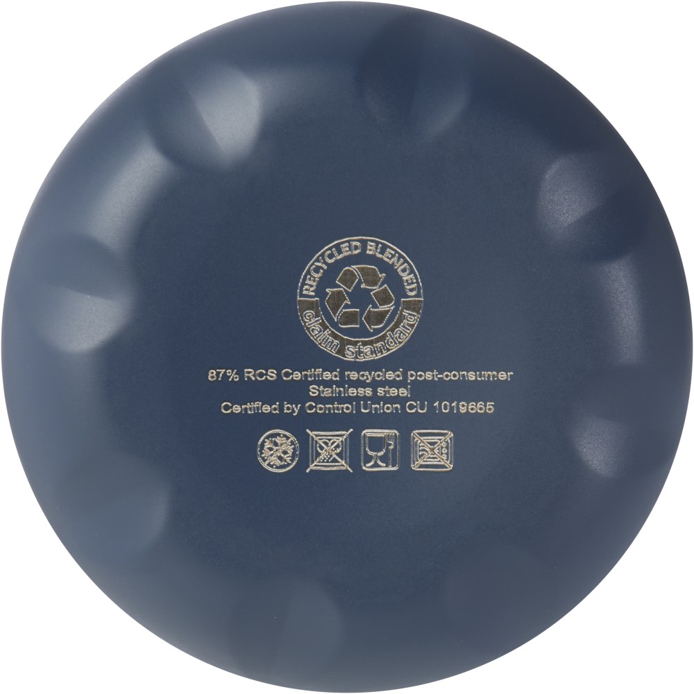 Vákuumszigetelt, RCS tanúsítvánnyal rendelkező, újrahasznosított rozsdamentes acél palack ikonikus dizájnnal, amely több órán keresztül tartja melegen vagy hidegen az italokat. A legtöbb pohártartóba illeszkedő talppal ellátott, elegáns megjelenésű vizes palack tökéletes promóciós termék. A német élelmiszer-biztonsági jogszabályok (LFGB) szerint, valamint a REACH-szabályozásnak megfelelően ftalát-tartalomra tesztelt és jóváhagyott. Űrtartalma: 500 ml. Újrahasznosított kartonból készült díszdobozban szállítjuk. Emblémázás: Bögredekor, Gravírozás