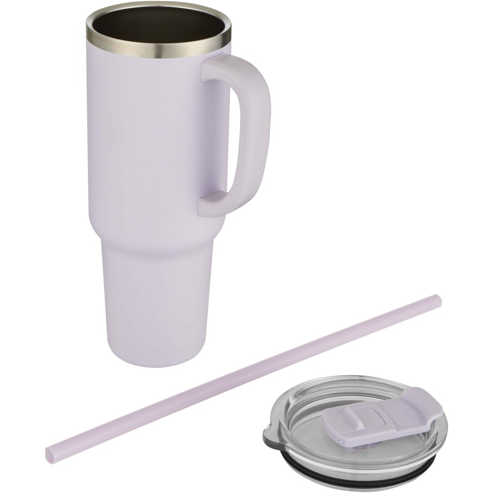 RCS tanúsítvánnyal rendelkező duplafalú rézvákuum szigetelésű pohár, amely 91%-ban használt rozsdamentes acélból készült és legalább 24 órán keresztül hidegen tartja az italokat. Tritan szívószállal rendelkezik, és csúsztatható fedél funkcióval van ellátva, amely megakadályozza a kiömlést. A 100%-ban újrahasznosított műanyag nyomófedél biztonságosan tartja a szívószálat a helyén, és könnyen forgatható, hogy hozzáférj az ivónyíláshoz. Tartós külső porfestett bevonat. Űrtartalom: 1200 ml. Kézi mosogatás javasolt. Stanley hasonmás. Emblémázás: Gravírozás