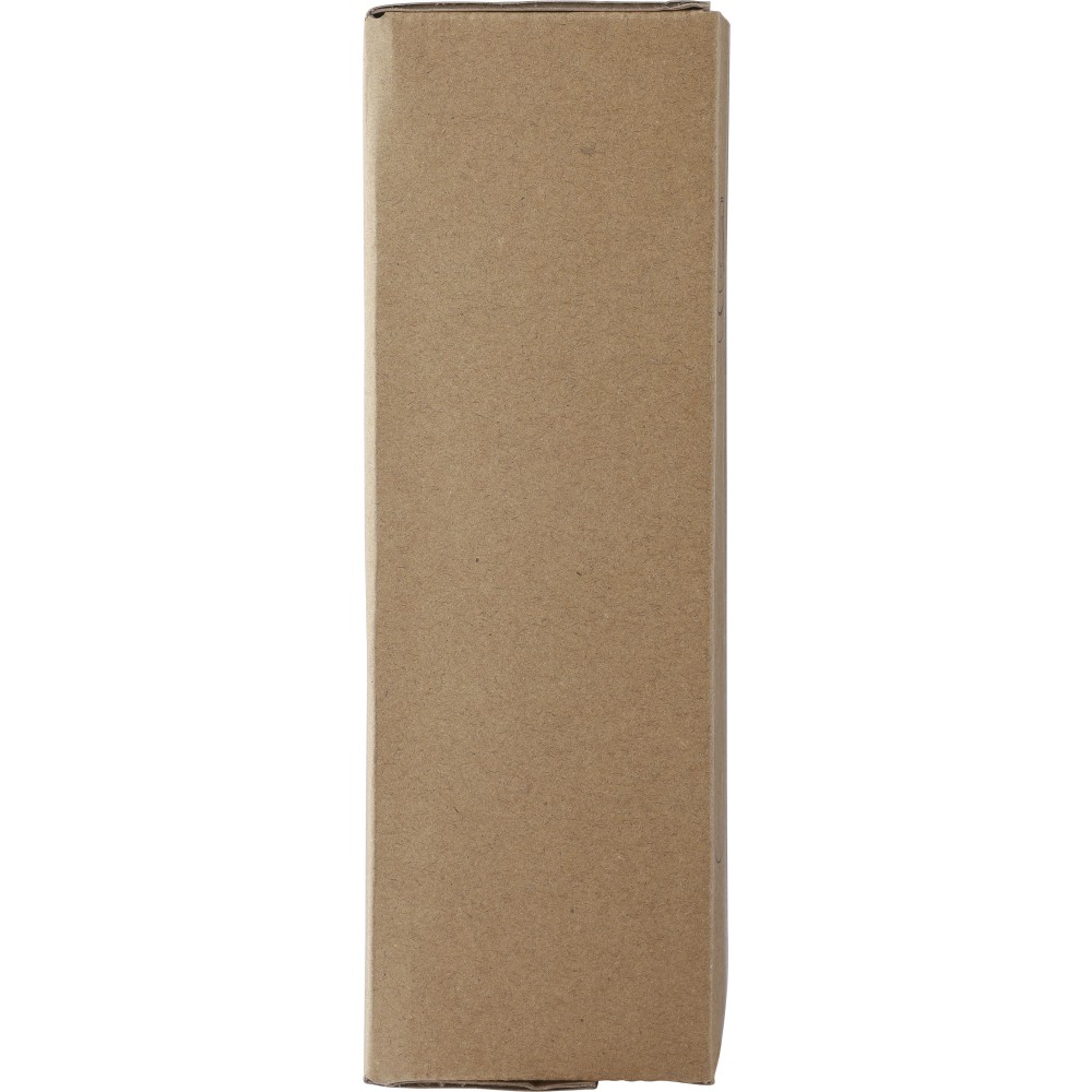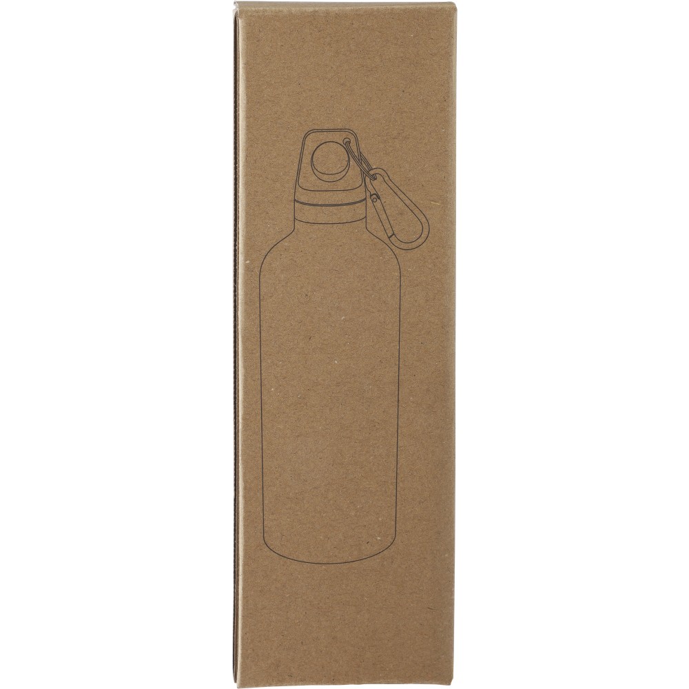 Újrahasznosított rozsdamentes acélból készült 500 ml-es palack PP kupakkal és alumínium karabinerrel. A kulacs a benne tárolt italt 8 órán át melegen, 12 órán át pedig hidegen tartja. Az ezüst szín kivételével külső felülete matt. Az újrahasznosított anyagra utaló logó a palackra van gravírozva. Mosogatógépben nem tisztítható. Csomagolása barna papírdoboz. Emblémázás: Bögredekor, Gravírozás