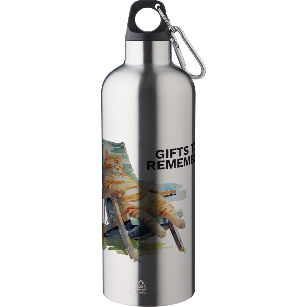Újrahasznosított rozsdamentes acélból készült 500 ml-es palack PP kupakkal és alumínium karabinerrel. A kulacs a benne tárolt italt 8 órán át melegen, 12 órán át pedig hidegen tartja. Az ezüst szín kivételével külső felülete matt. Az újrahasznosított anyagra utaló logó a palackra van gravírozva. Mosogatógépben nem tisztítható. Csomagolása barna papírdoboz. Emblémázás: Bögredekor, Gravírozás