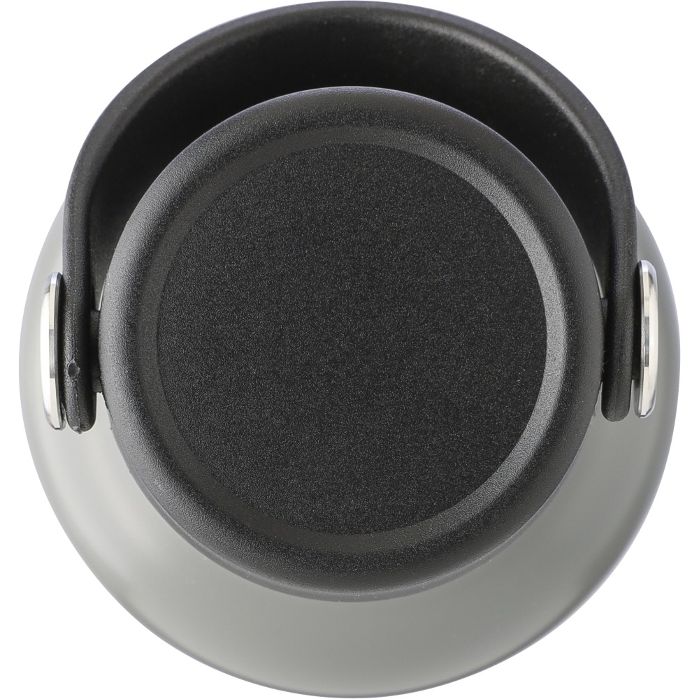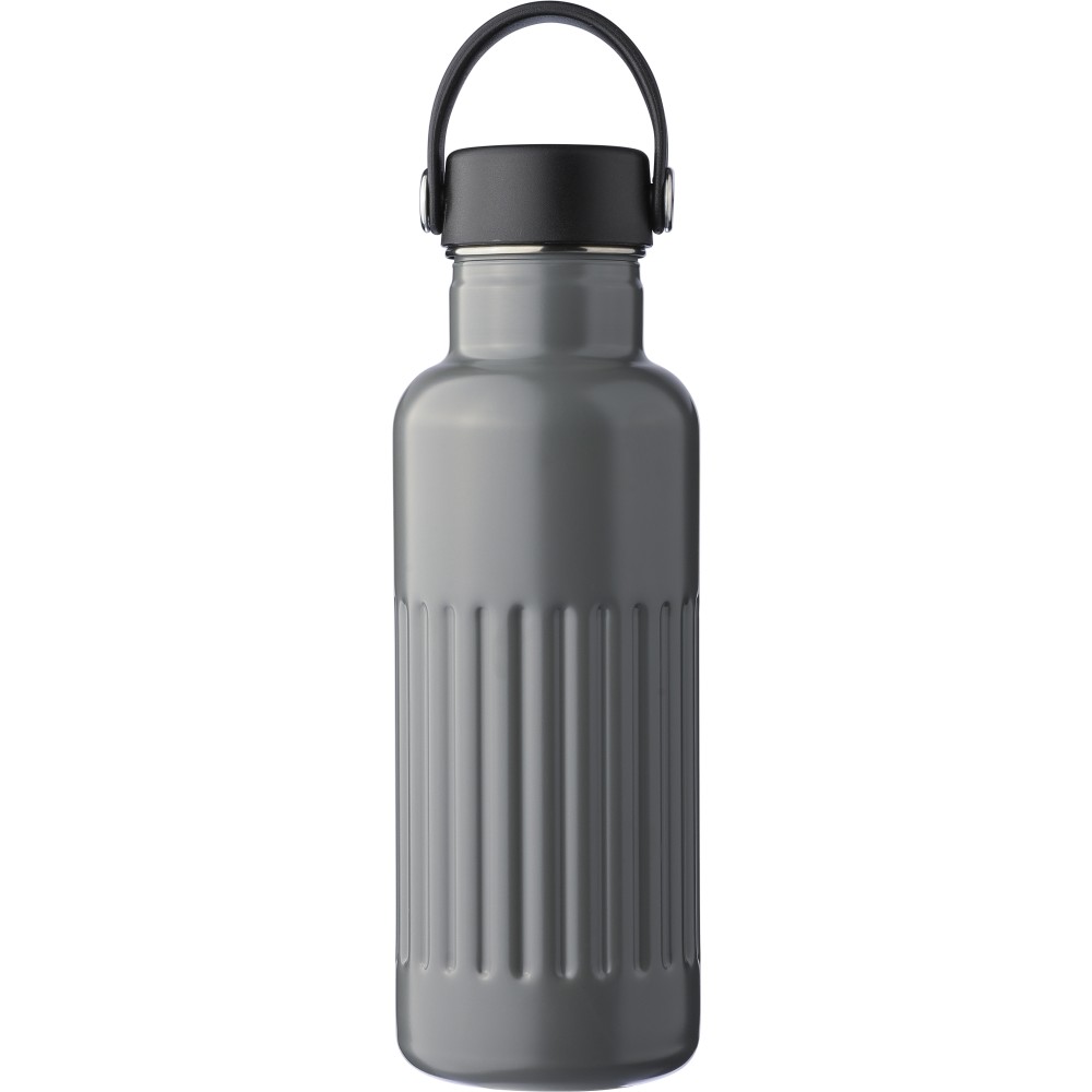 Újrahasznosított rozsdamentes acél termosz, 500 ml. A belső 304-es, a külső 201-es rozsdamentes acélból készült, bordás markolattal, PP és fém fedéllel, műanyag hordozófüllel. Gravírozott újrahasznosított logó található a terméken. Csomagolása barna papírdoboz. Emblémázás: Bögredekor, Gravírozás