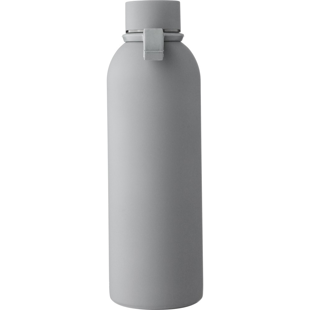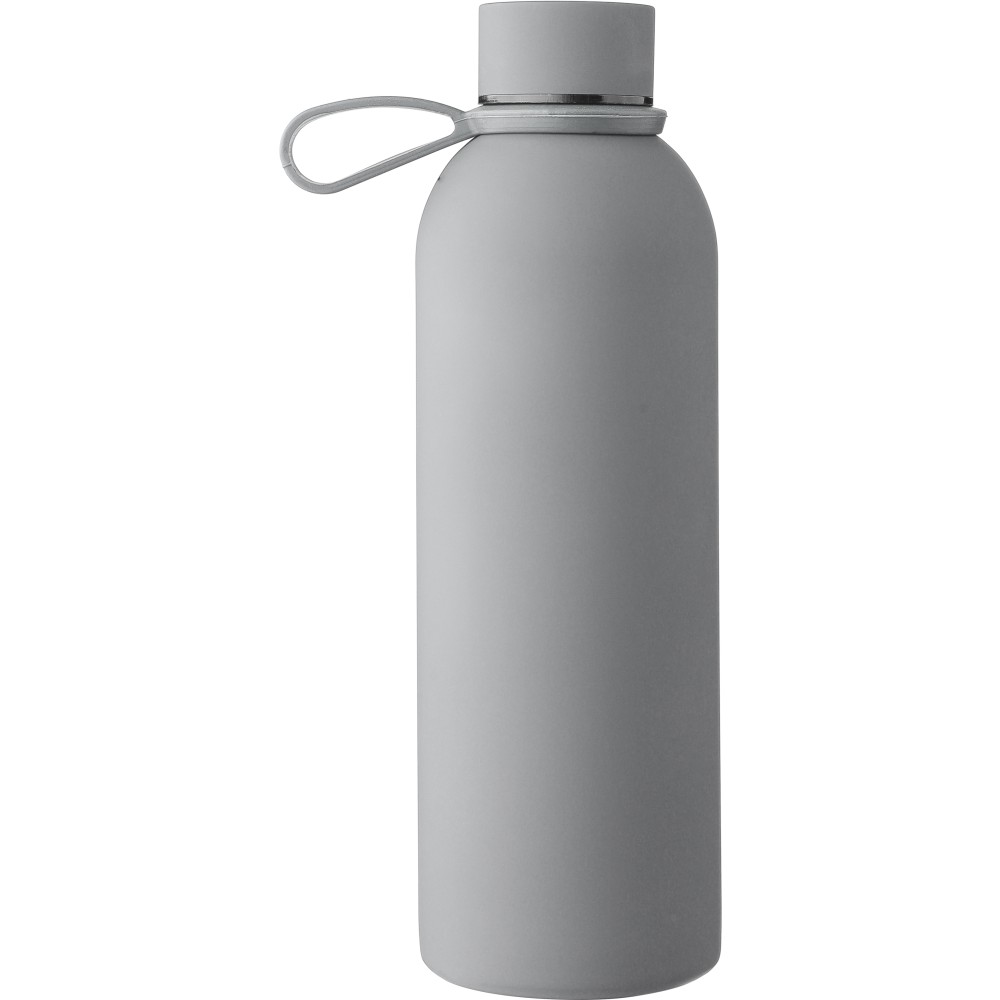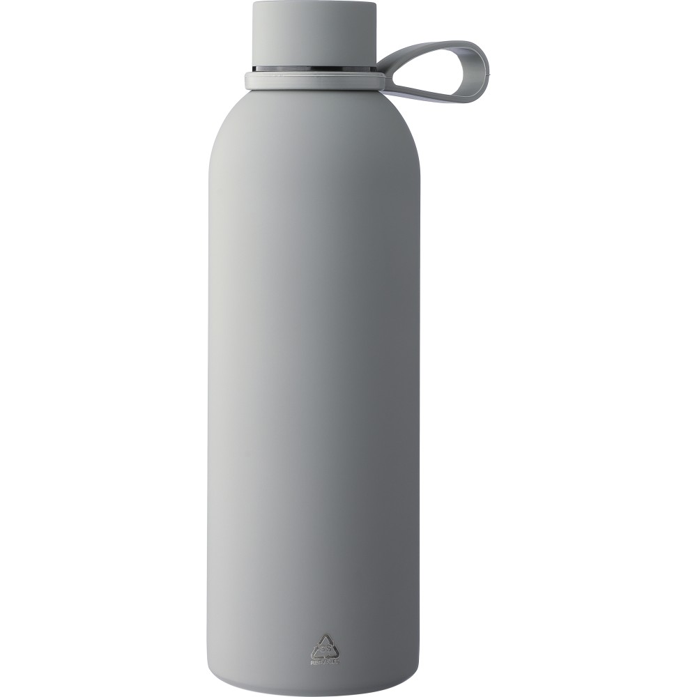Újrahasznosított rozsdamentes acélból készült duplafalú vákuumpalack, 500 ml-es. 304-es rozsdamentes acél belsővel és 201-es rozsdamentes acél külsővel. Gumírozott felülettel, fém díszítésű csavaros PP kupakkal és szilikon hordfüllel. Gravírozott, újrahasznosított logóval. Csomagolása barna papírdoboz. Emblémázás: Gravírozás