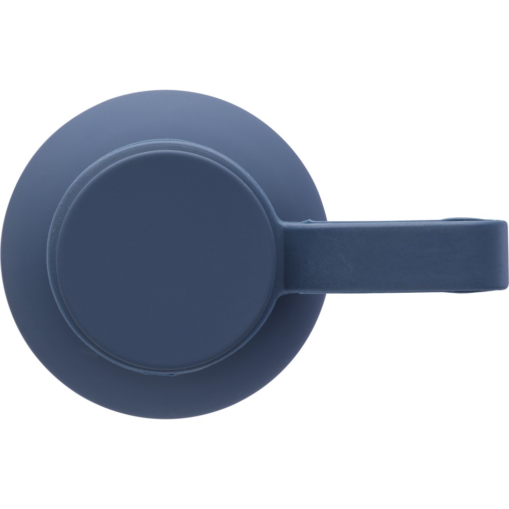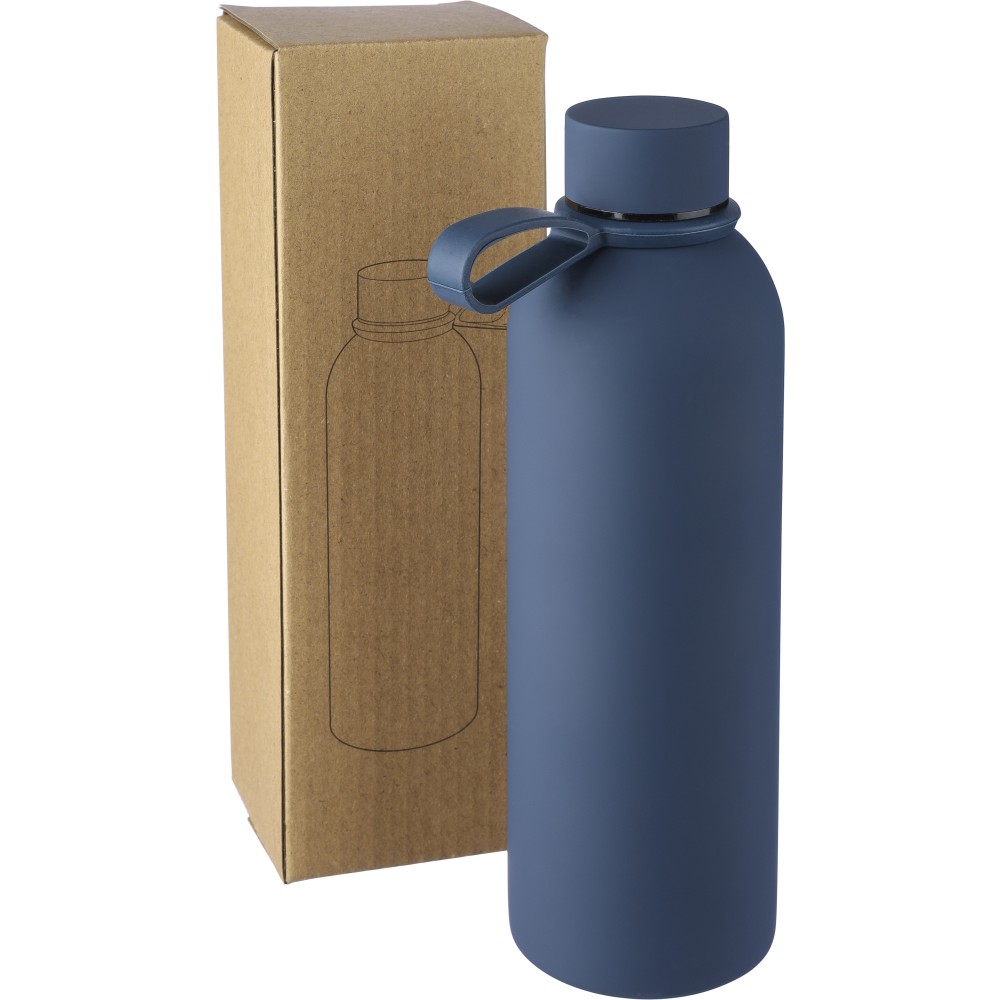 Újrahasznosított rozsdamentes acélból készült duplafalú vákuumpalack, 500 ml-es. 304-es rozsdamentes acél belsővel és 201-es rozsdamentes acél külsővel. Gumírozott felülettel, fém díszítésű csavaros PP kupakkal és szilikon hordfüllel. Gravírozott, újrahasznosított logóval. Csomagolása barna papírdoboz. Emblémázás: Gravírozás