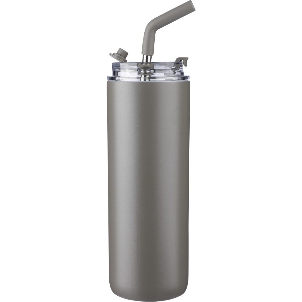 Duplafalú rozsdamentes acél kulacs (500 ml), belső anyaga 304-es rozsdamentes acél, külső része pedig 201-es rozsdamentes acél. Két tetővel szállítjuk: egy hordozófüles PP tetővel és egy átlátszó PS tetővel, amely a mellékelt rozsdamentes acél szívószállal, szilikon véggel és tartóval használható. Egyenként csomagolva, barna kartondobozban. Emblémázás: Bögredekor, Gravírozás, Körszita