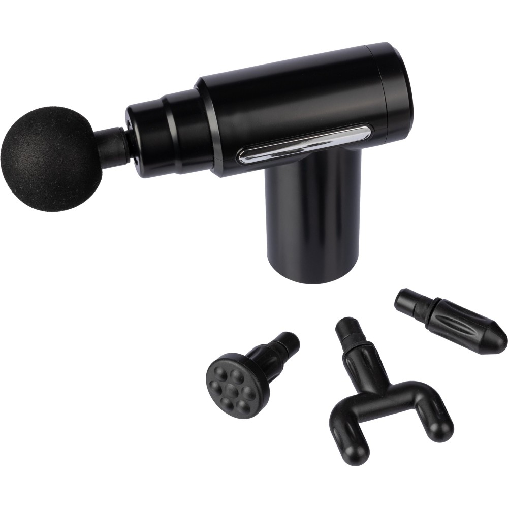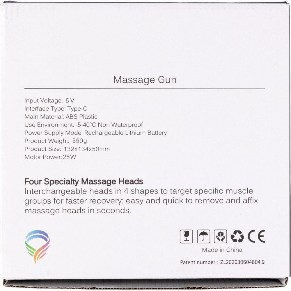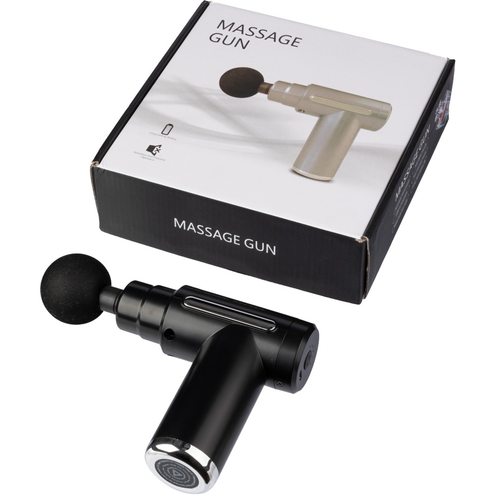 Masszázspisztoly (1.800-3.200 fordulat/perc) 1.200 mAh-s újratölthető akkumulátorral. 5 V bemenet és 6 intenzitási fokozat az izmok masszírozásához. Egyedi csomagolásban, darabonként díszdobozban, 4 masszázsfejjel érkezik. Emblémázás: Tamponnyomás