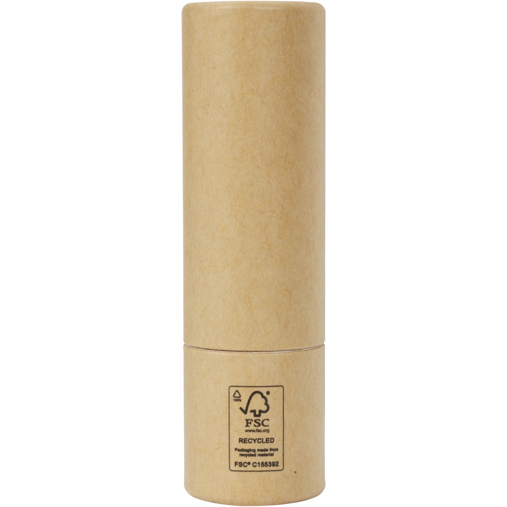 Ajakápoló. Védelmet nyújt a nap ultraibolya (UV) sugarai ellen. Úgy tervezték, hogy hidratálja és védje az ajkakat. A külső burkolat újrahasznosított papírból készült. Jó választás magánszemélyek és vállalkozások számára, akik a fenntarthatóbb termékeket részesítik előnyben. Az illata vanília. Szavatosság: vásárlástól számított 3 év. FSC újrahasznosított 100% P10 CU-COC-877277. Emblémázás: Tamponnyomás, UV nyomtatás