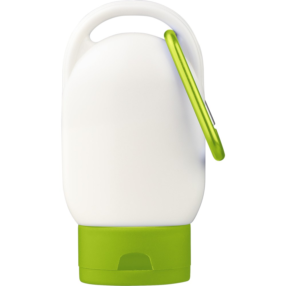 SPF 30 faktorszámú naptej színes kupakkal és a kupak színével harmonizáló karabinerrel. A hátoldalon az összetevőlista és a minőségmegőrzési idő szerepel. Szavatossági ideje 2 év. 30 ml. Emblémázás: Matricázás, Tamponnyomás