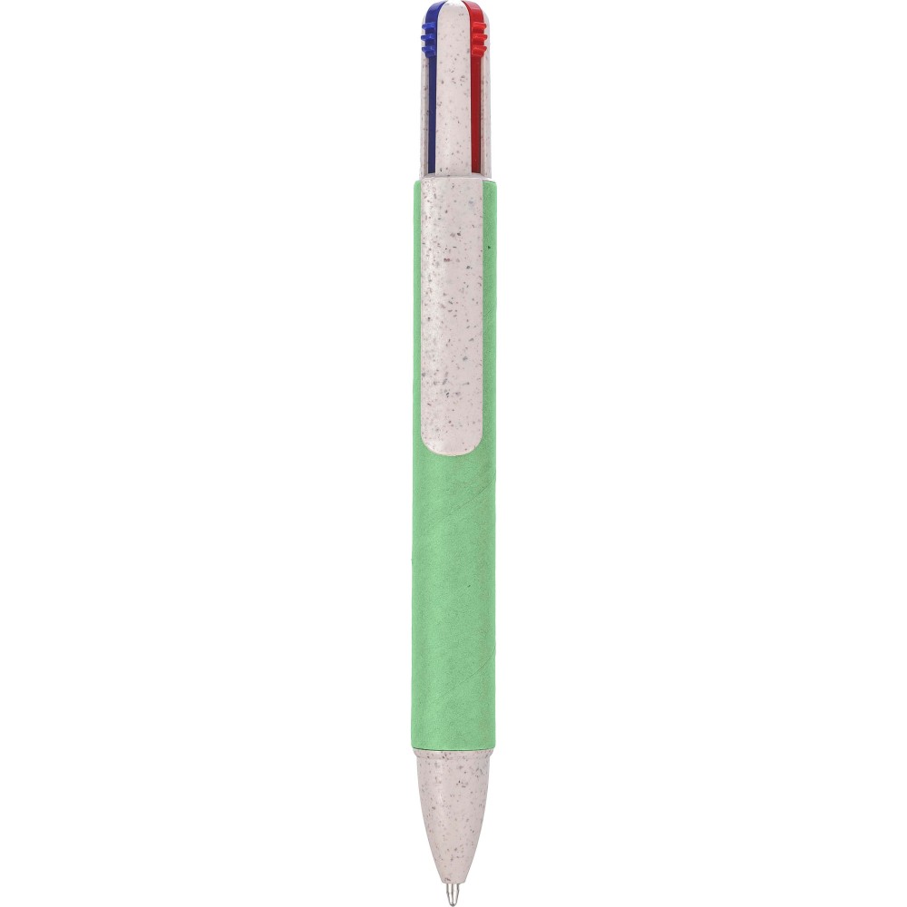 Újrahasznosított kartonból és szalmából készült négyszínű golyóstoll. Kb. 300 méter íráshossz színenként. Tollbetét színek: kék, fekete, piros és zöld. Emblémázás: Tamponnyomás, UV nyomtatás