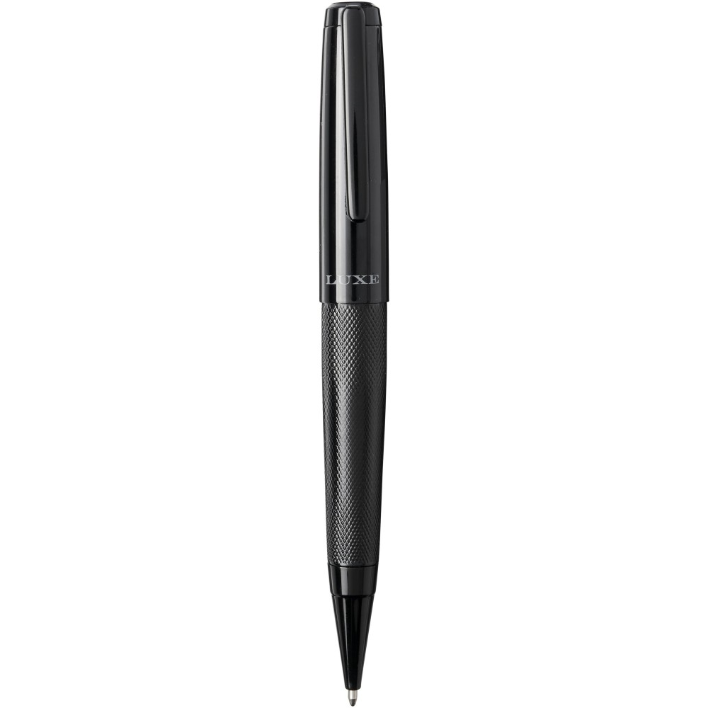 Golyóstoll és rollerball készlet Luxe díszdobozban. Golyóstoll mérete: 14 cm x 1.45 cm, súlya: 40 gr, a tollbetét írási kapacitása: 800 m. Rollerball mérete: 13.8 cm x 1.45 cm, súlya: 54 gr. Rollerball írási kapacitása: 400 m. Fém. Emblémázás: Gravírozás