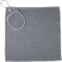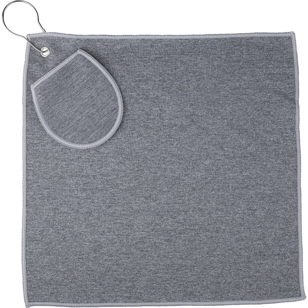 rPET golftörölköző tartozék labdatartó tokkal. A fém kampó segítségével könnyen a táskához csatlakoztatható. Belül rPET címkével. Mosógépben alacsony hőmérsékleten mosható. Emblémázás: Hímzés, Szitanyomás