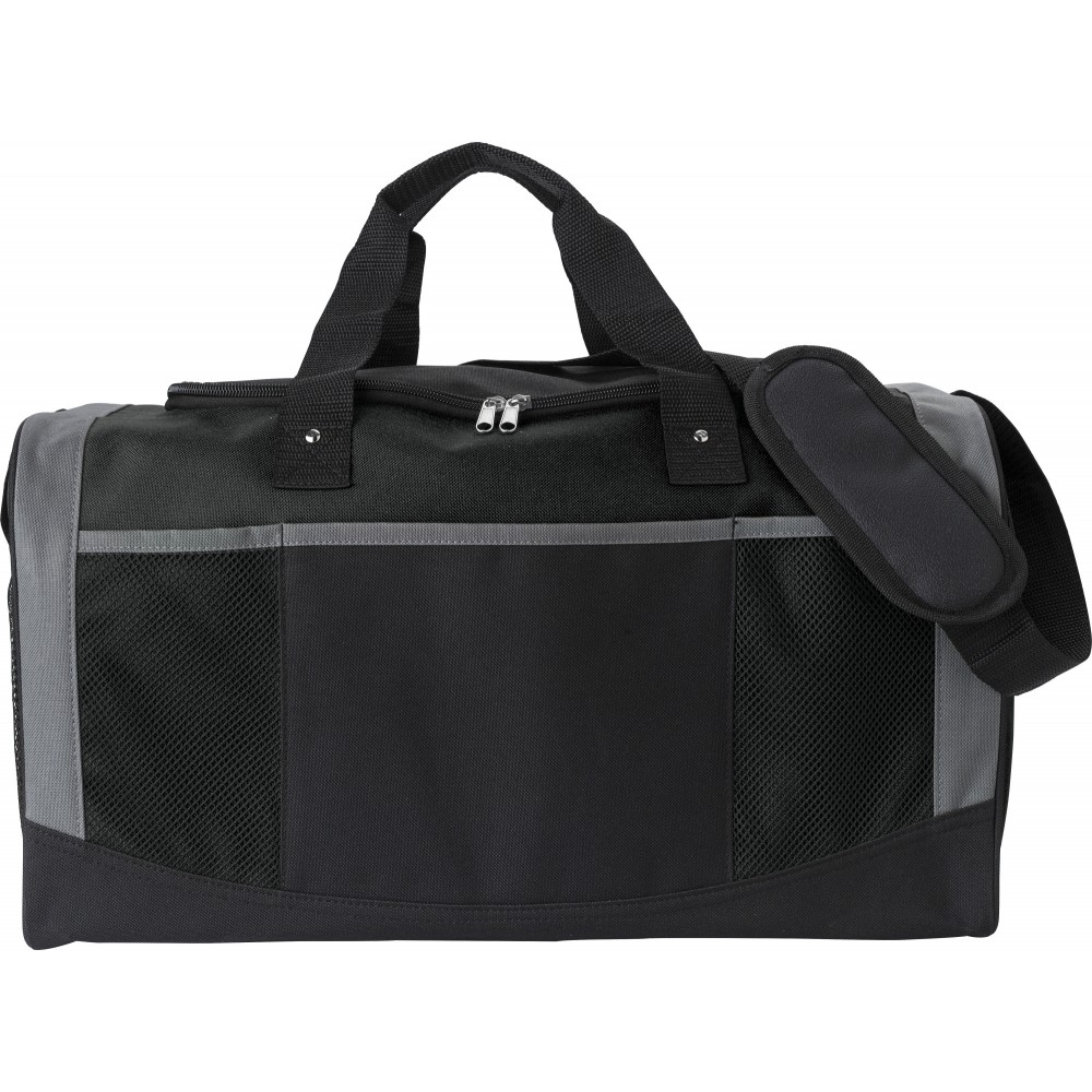 Sporttáska rövid fogantyúval és állítható vállpánttal. Egy nagy rekesz cipzárral, egy hálós zseb az oldalán, 3 elülső zseb. Megerősített alj. Poliészter 600D. Emblémázás: Szitanyomás