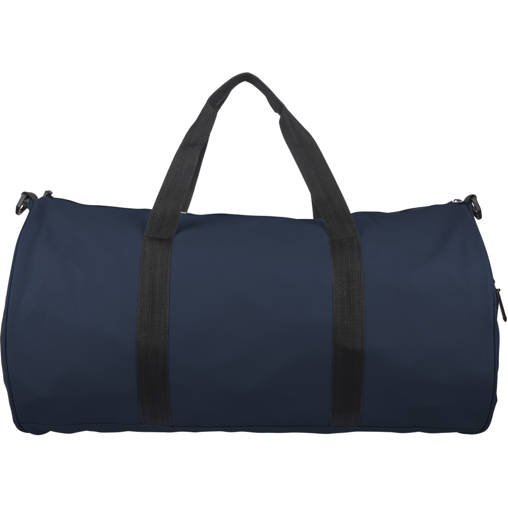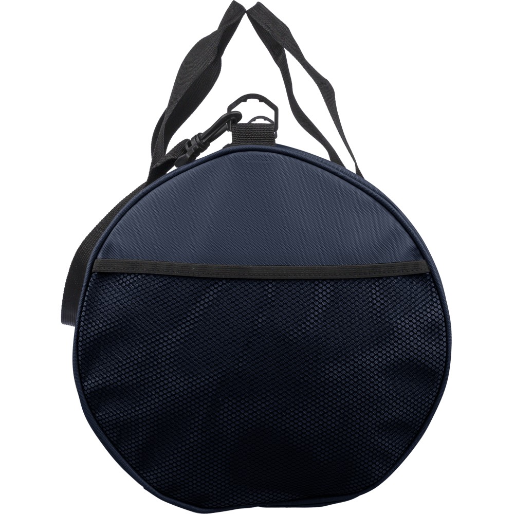 600D poliészterből készült rPET sporttáska 210D béléssel és vízlepergető PU bevonattal, 40 literes űrtartalommal. Elülső és oldalsó cipzáras zsebbel, hálós oldalzsebbel, két fogantyúval és állítható vállpánttal rendelkezik. Külső felületén rPET címkével ellátva. Emblémázás: Szitanyomás