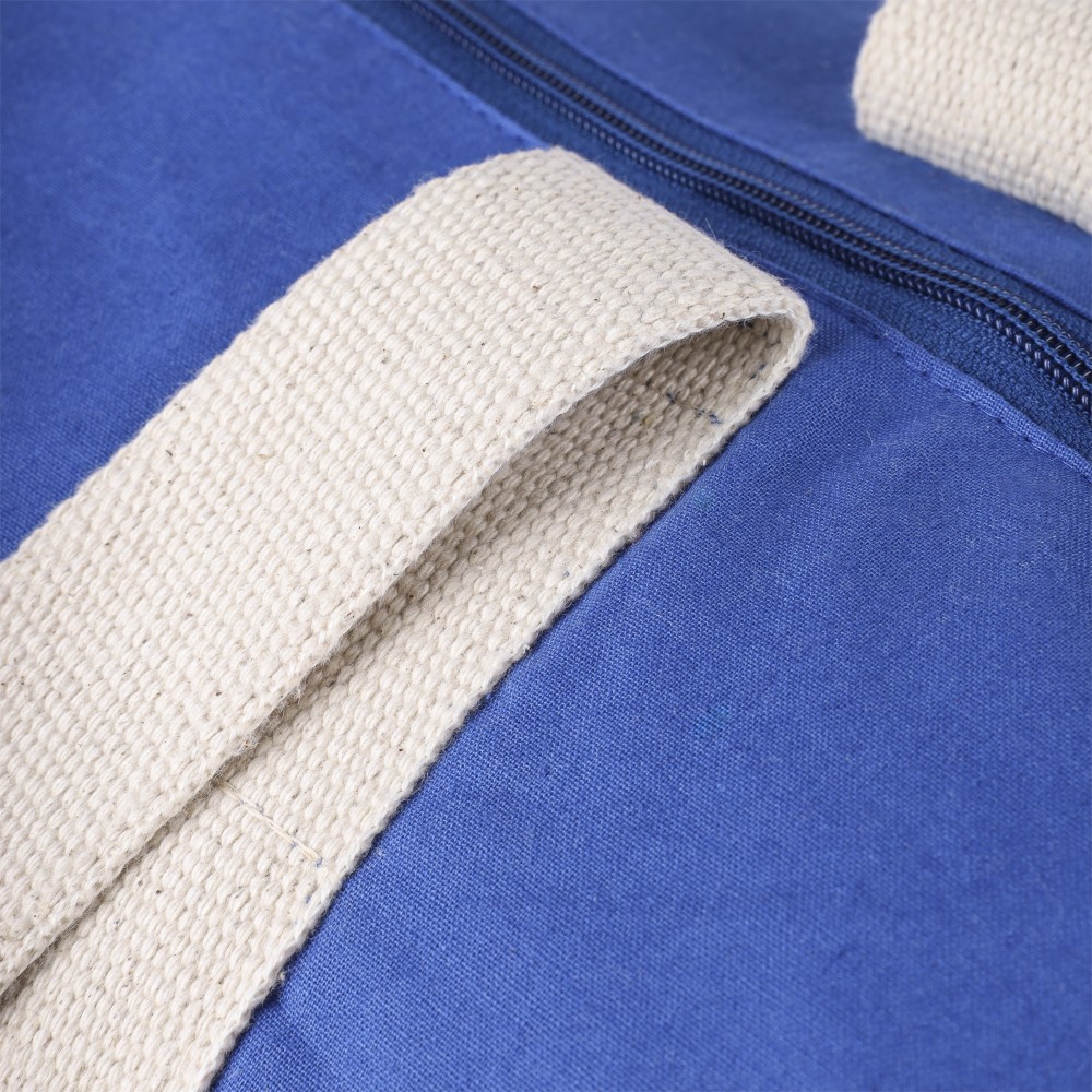 Oeko-Tex minősítésű, 180 g/m2 pamutból készült színes, cipzáras sporttáska 60 cm hosszúságú és 5 cm szélességű natúr pamutfülekkel. Oeko-Tex címkével ellátva. Emblémázás: Szitanyomás