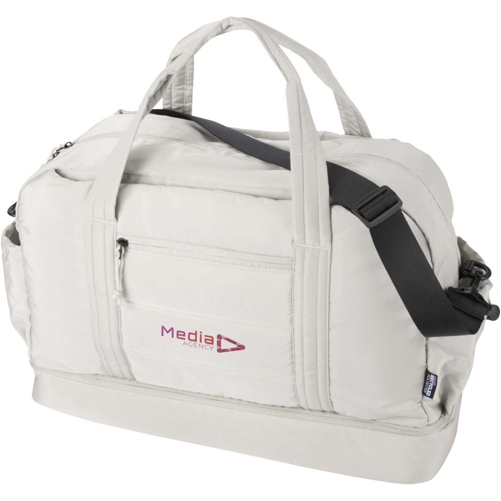 A Puffer sporttáska egyedi megjelenést ötvöz prémium minőségű, GRS tanúsítvánnyal rendelkező újrahasznosított alapanyagokkal, így ideális választás a mindennapi használathoz. A 30 literes űrtartalom tökéletes rövid utazásokhoz, edzéshez vagy hétköznapi teendőkhöz. A táska tágas, cipzáras fő rekesszel rendelkezik ruhák és felszerelések számára, valamint egy szigetelt, PEVA bélésű alsó rekesszel, amely lehetővé teszi a nedves és száraz holmik elkülönítését. A több belső és külső zseb segíti az átlátható rendszerezést, míg a bőröndre rögzíthető pánt, az állítható vállpánt és a kézifogantyúk sokoldalú hordozási lehetőséget biztosítanak. Könnyű és vízlepergető kialakításának köszönhetően ez a sporttáska könnyedén alkalmazkodik az életviteledhez. Emblémázás: Szitanyomás