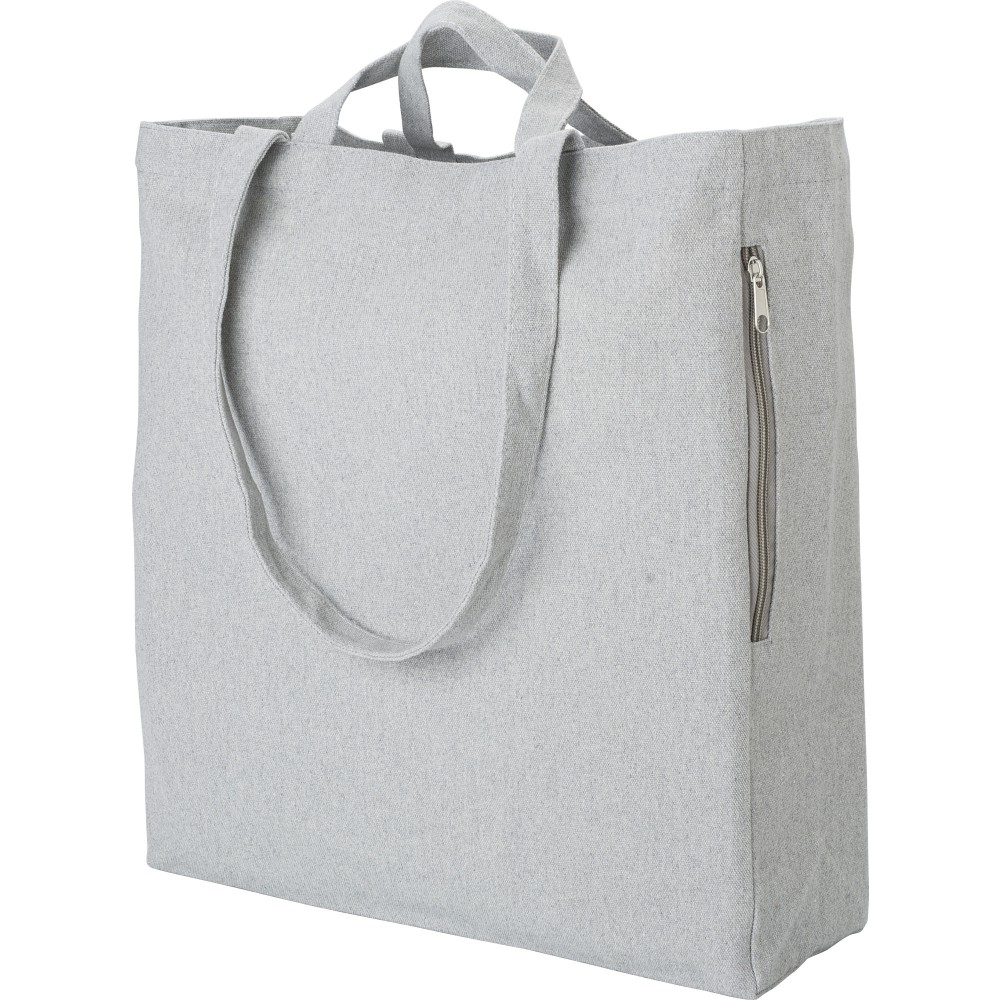 Újrahasznosított pamut bevásárlótáska rövid és hosszú füllel. Oldalt cipzáras zseb. 350g/m2 Emblémázás: Szitanyomás