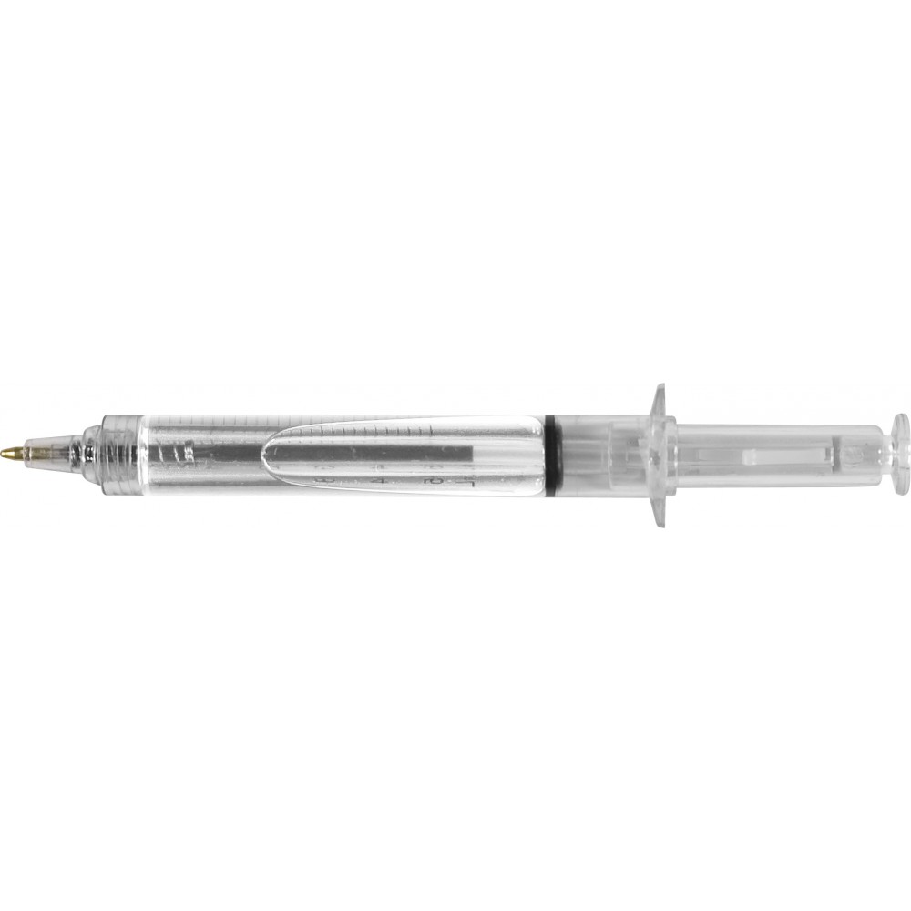 Injekció formájú golyóstoll színes folyadékkal töltve, fekete tollbetéttel. Emblémázás: Tamponnyomás, UV nyomtatás