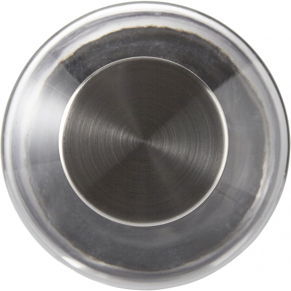 Átlátszó vizespalack fém alsó résszel és fém csavaros kupakkal. A kupak gumigyűrűje színben illeszkedik a palack színével. 850 ml. Nem szivárgásmentes. Mosogatógépben nem tisztítható. BPA-mentes műanyag. Emblémázás: Gravírozás, Körszita, Tamponnyomás