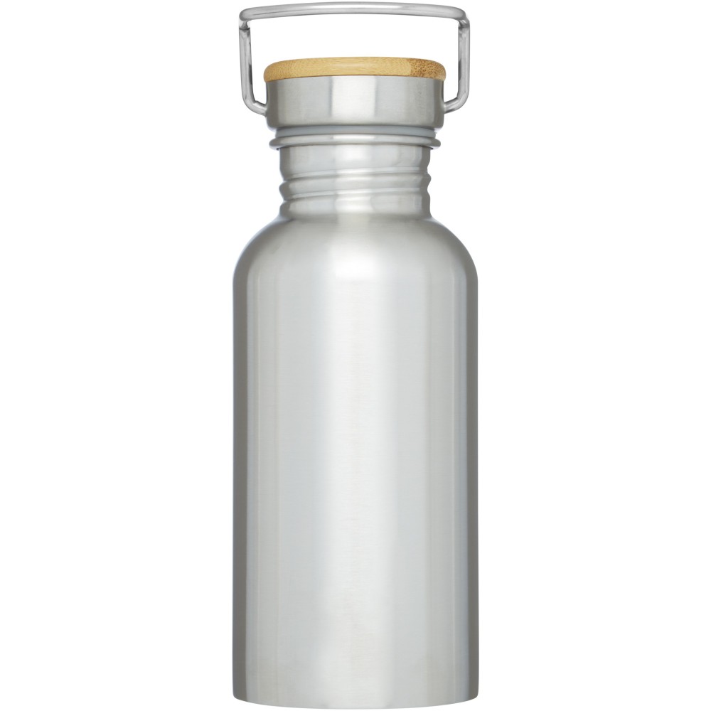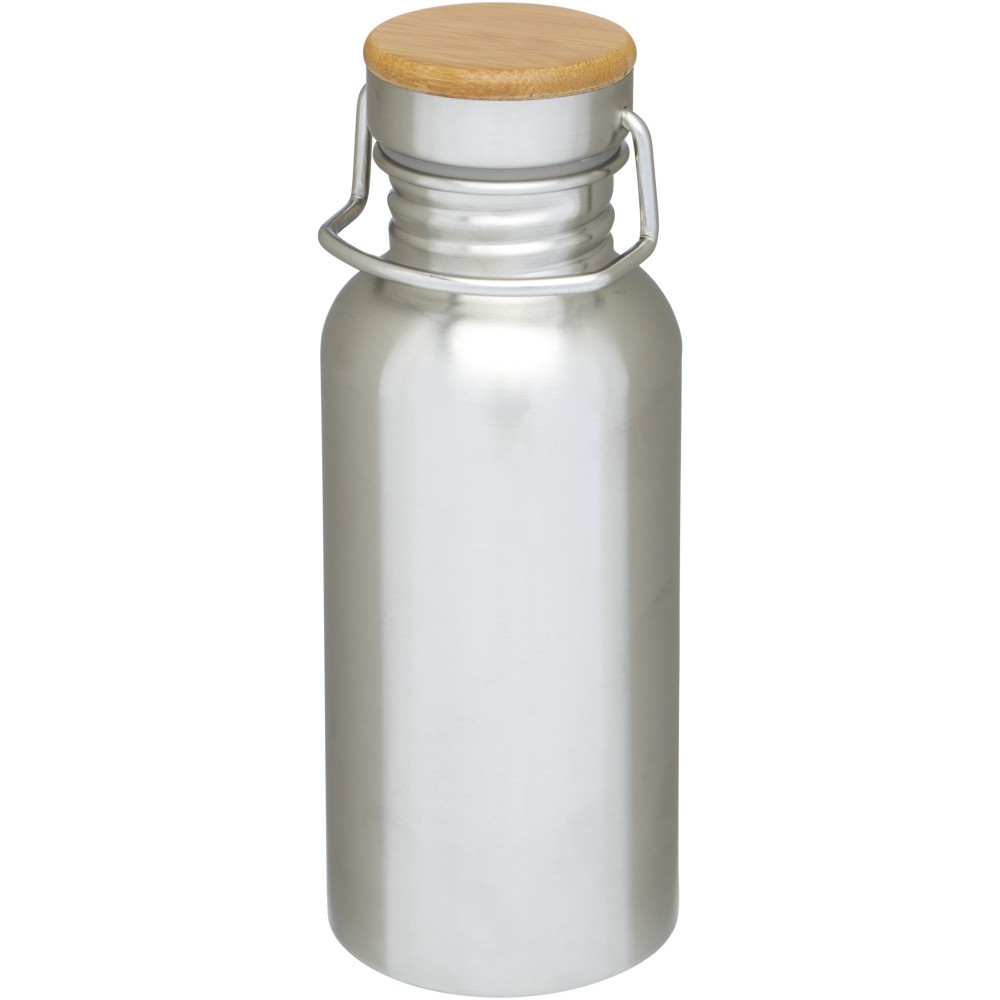 Egyfalú rozsdamentes acél palack csavaros tetővel. A fedélen bambusz rátét, valamint egy fül a könnyű hordozhatóságért. Szivárgásmentes. Szénsavas italokkal nem használható. Mosogatógépben nem mosható és mikrohullámú sütőben történő melegítésre nem alkalmas. Űrtartalom: 550 ml. Csomagolása Avenue díszdoboz. Rozsdamentes acél, bambusz. Emblémázás: Bögredekor, Gravírozás, Körszita, Tamponnyomás