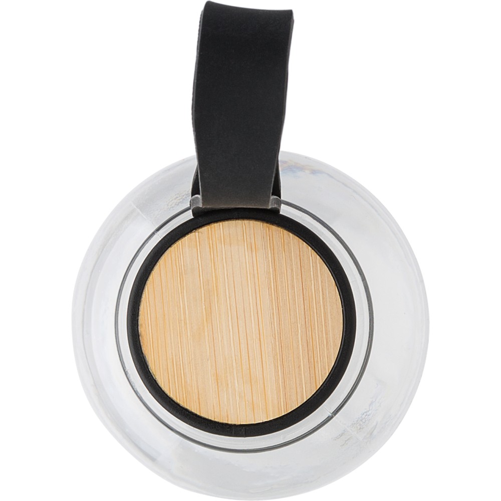 RPET ivópalack (500 ml) PP fedéllel, bambusz részletekkel a felső oldalon. Szilikon hordozópánt. Egyenként újrahasznosított zacskóba csomagolva. Emblémázás: Tamponnyomás