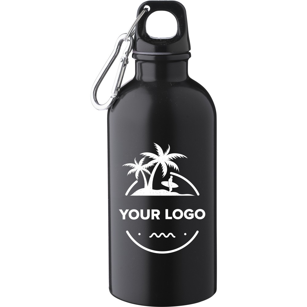 Újrahasznosított rozsdamentes acélból készült 400 ml-es szimplafalú kulacs PP kupakkal és alumínium karabinerrel. Az újrahasznosított anyagra utaló logó a palackra van gravírozva. Mosogatógépben nem tisztítható. Emblémázás: Bögredekor, Gravírozás